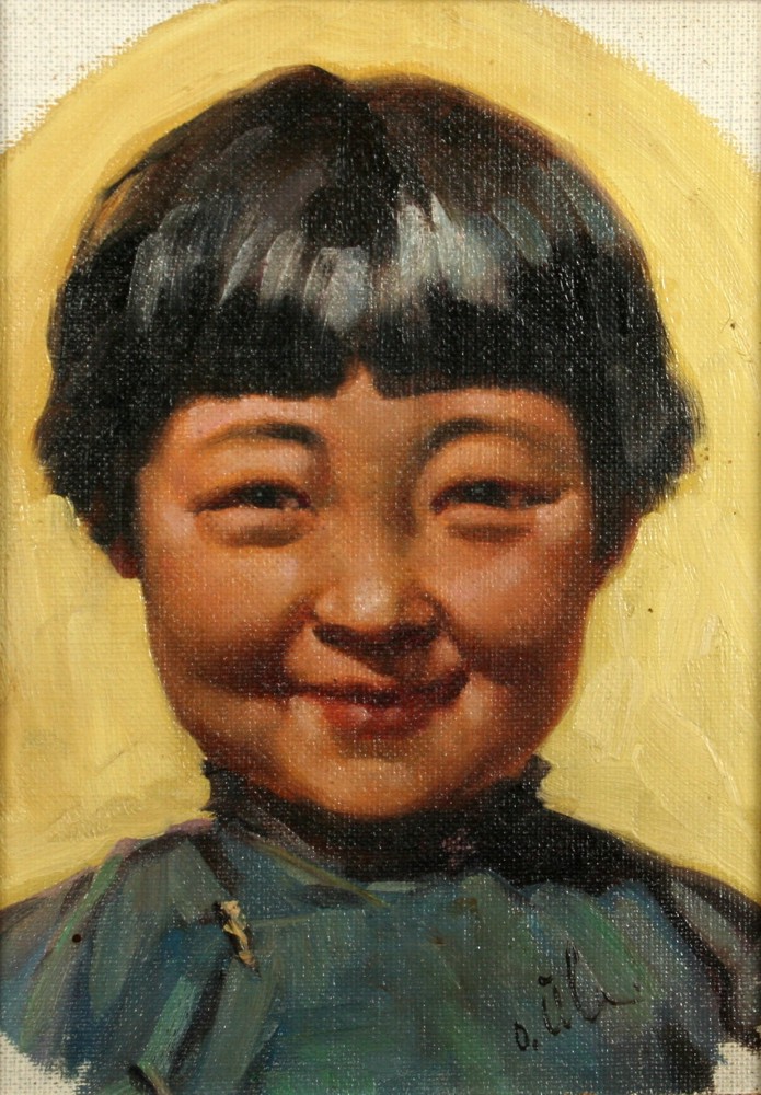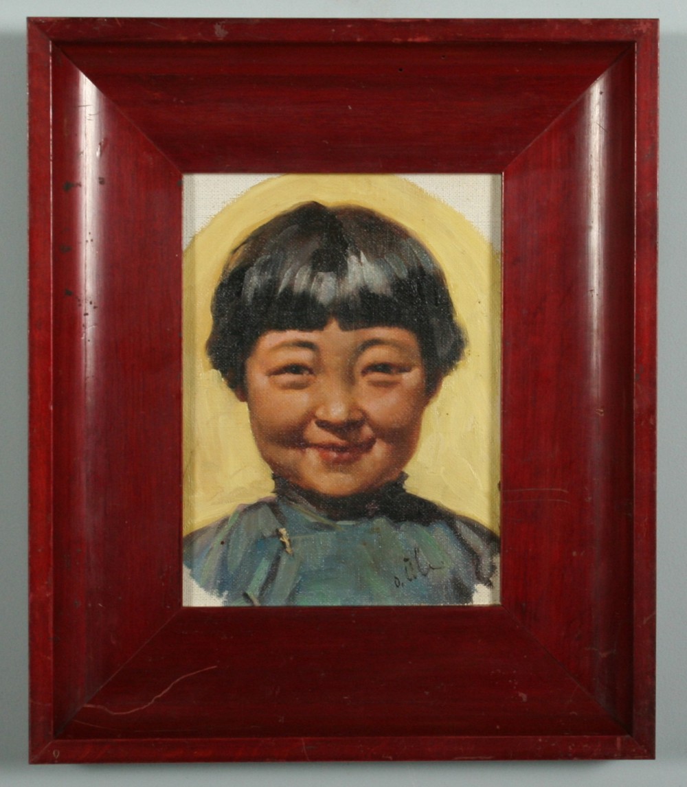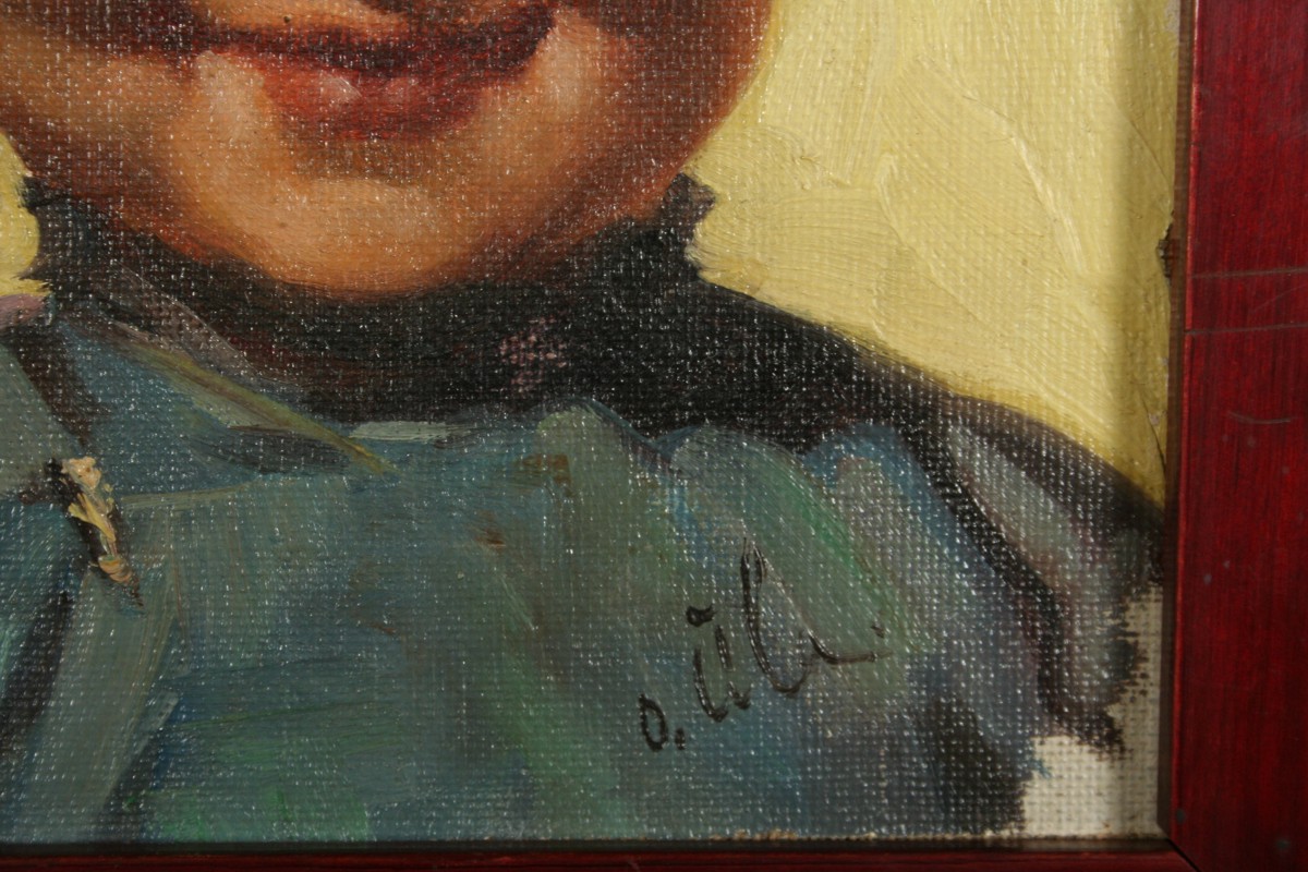 obraz dětského portrétu z orientu, olej na plátně lepeném na kartonu 18,5 x 13,5 cm s rámem 31 x 26 cm, autor Otakar Číla, podepsáno vpravo dole O. Číla, rámováno v rámu z 30. let
