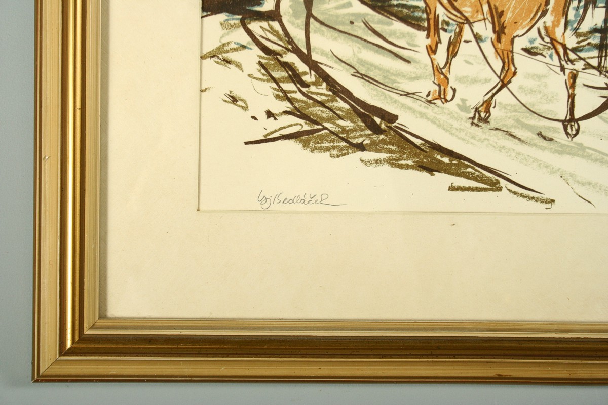kůň s povozem a vozkou jedoucí krajinou, barevná litografie na papíře, ve výřezu 30 x 46 cm s rámem 51 x 66 cm, autor Vojtěch Sedláček, podepsáno vlevo dole Vojt. Sedláček, rámováno v paspartě a rámu pod sklem