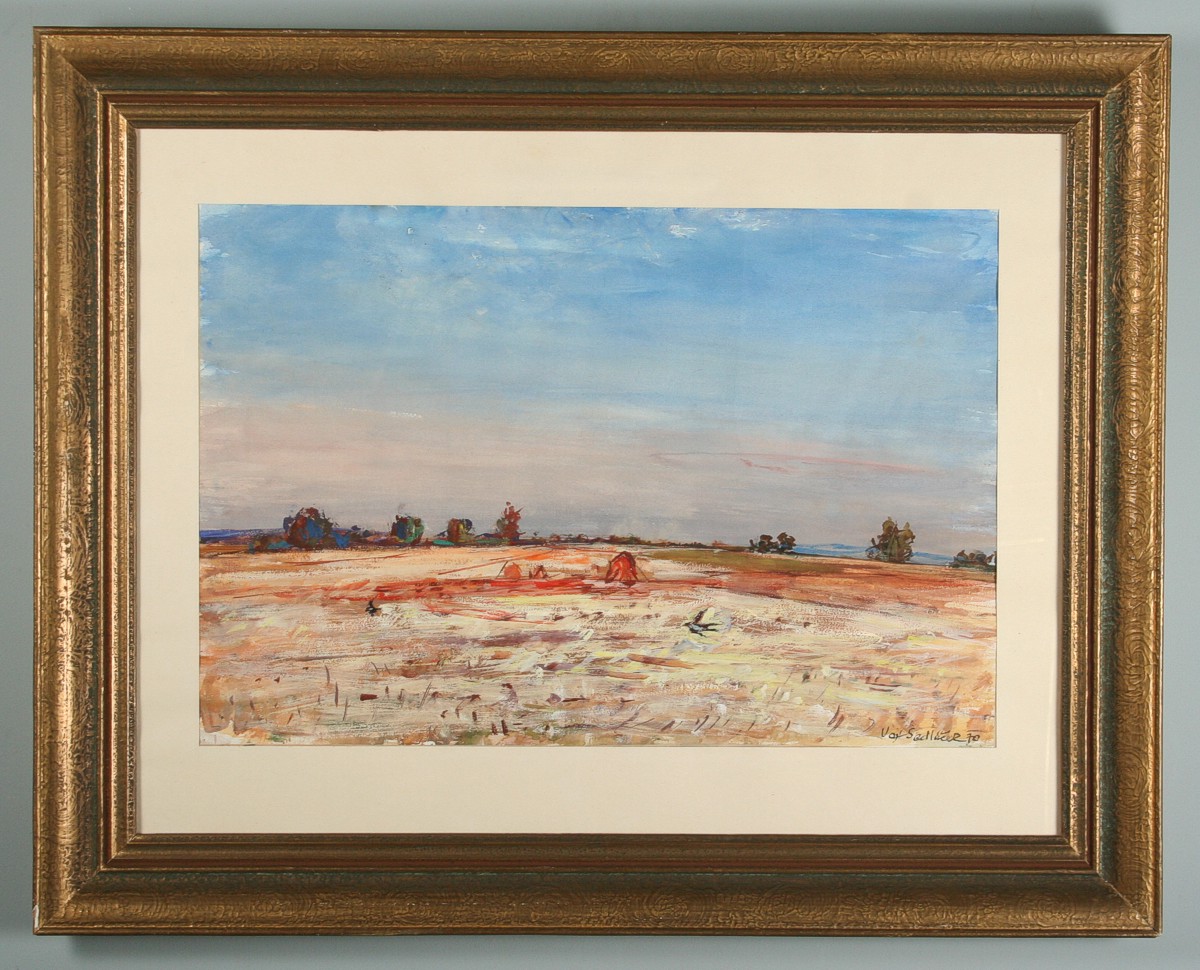 obraz letní krajiny s vlašťovkami, guasch na kartonu, ve výřezu 40 x 59 cm, s rámem 67 x 83 cm, autor Vojtěch Sedláček, podepsáno vpravo dole Vojt. Sedláček 70, rámováno v původní paspartě a rámu pod sklem