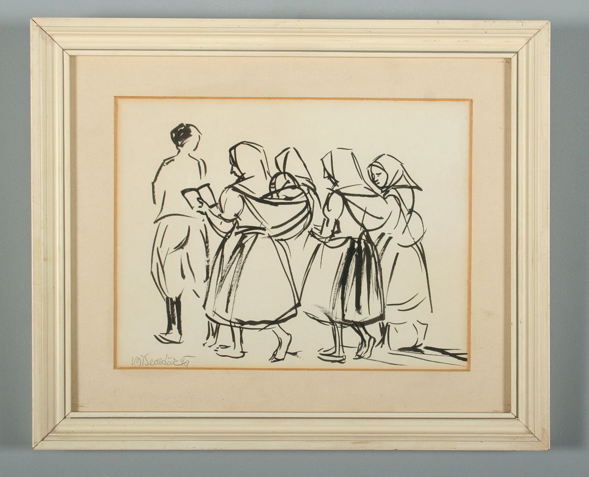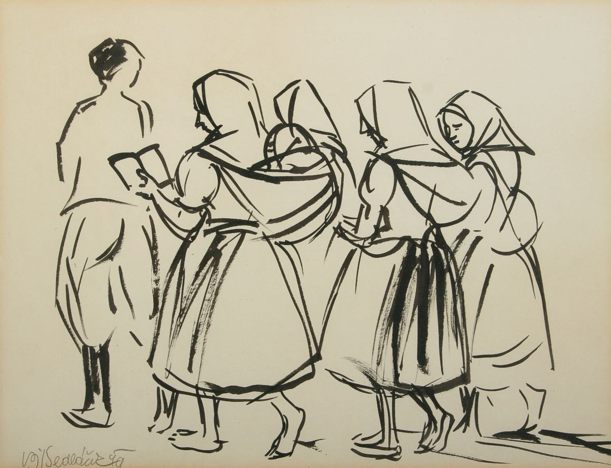 varianta ilustrace z Roku na vsi, kresba tuší na papíře 26x 20 cm s rámem 30 x 36 cm, autor Vojtěch Sedláček, podepsáno tužkou vlevo dole Vojt. Sedláček 49, na zadní straně přípis s dedikací, rámováno v paspartě pod sklem