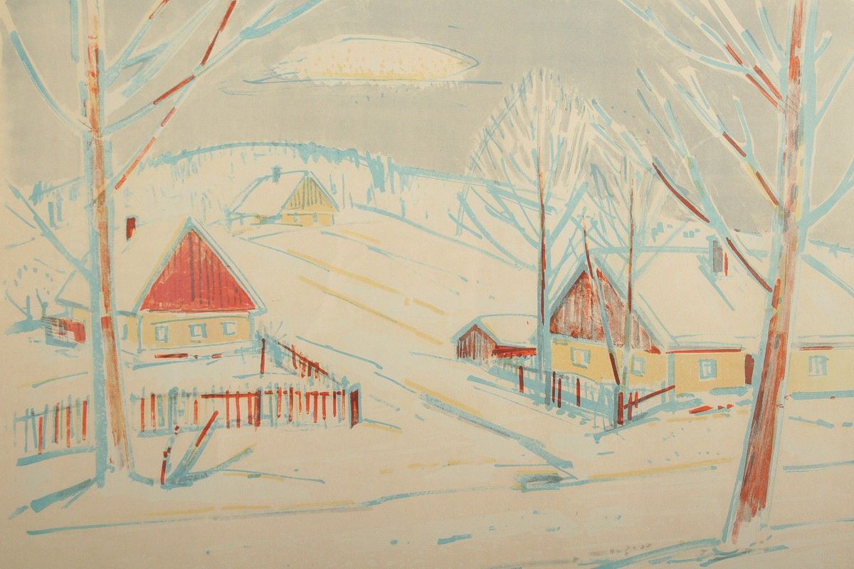 obraz zimní krajiny s chalupami, barevná litografie na papíře, tisková plocha 44 x 59 cm s rámem 69 x 83 cm, autor Jaroslav Grus, podepsáno vpravo dole červeně J. Grus, rámováno v původním rámu pod sklem