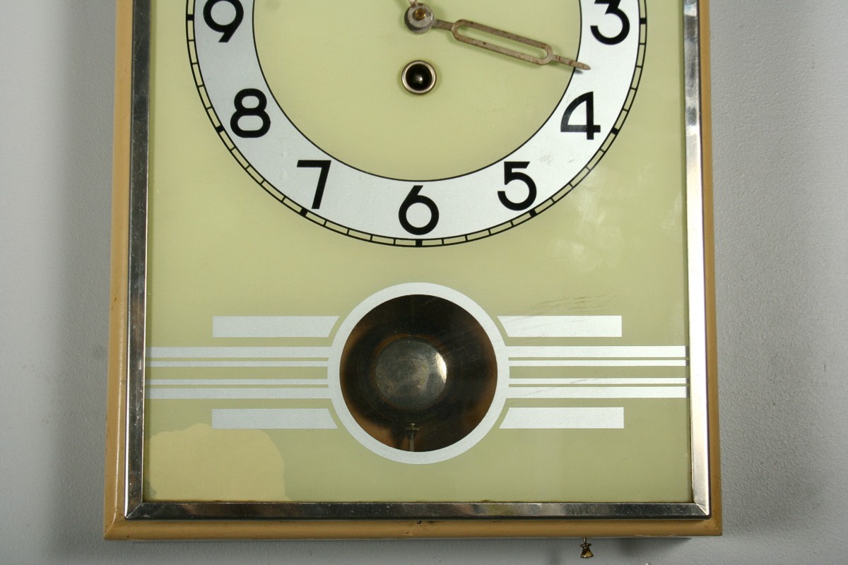 závěsné hodiny v dřevěné skříňce, skleněný ciferník, značeno KIENZLE, pochromované prvky, moderní vzhled 1. třetiny 20.století, stroj značený Kienzle, funkční s klíčkem, 33 x 24,5 cm