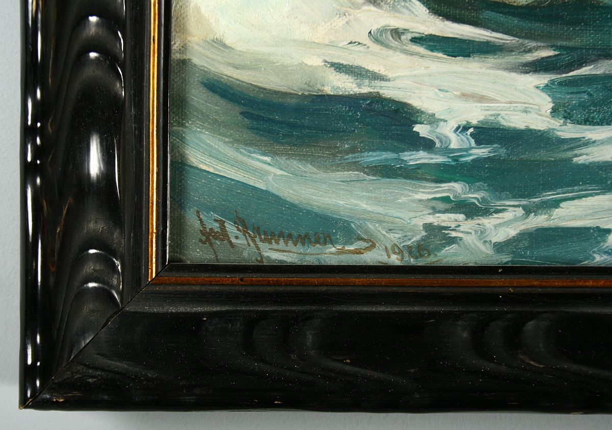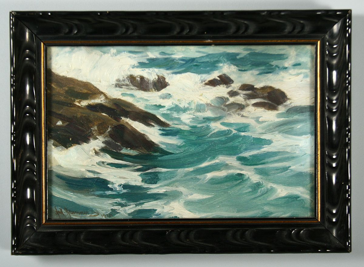 mořské vlny tříštící se o útesy, olej na plátně na lepence, ve výřezu 20,5 x 31,5 cm s rámem 28,5 x 39,5 cm, autor, na zadní straně štítek, podepsáno vlevo dole s datací 1926, rámováno pod sklem