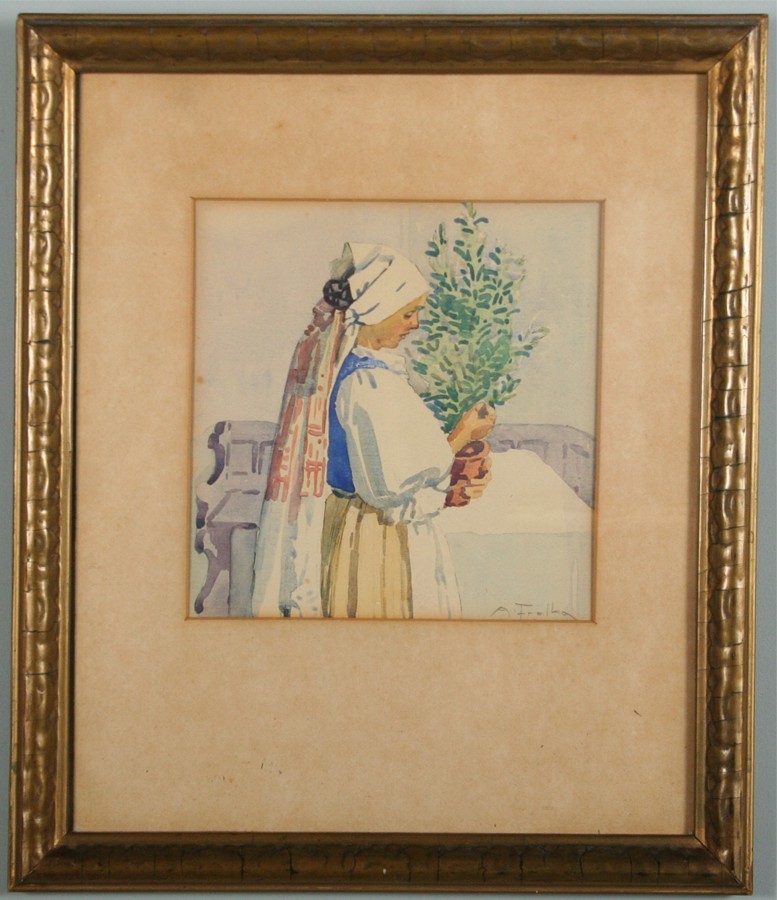 dívka s květinou, akvarel na papíře, ve výřezu 18 x 17 cm s rámem 38 x 33 cm, autor Antoš Frolka podepsáno vpravo dole akvarelem A. Frolka, rámováno v původní paspartě a rámu pod sklem