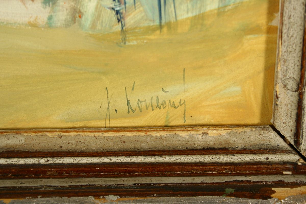 chaloupka s předzahrádkou s rozkvetlými stromy, tempera na lepence, ve výřezu 34 x 49 cm s rámem 50 x 65 cm, podepsáno v pravo dole J. Konečný, na zadní straně částečně dochovaný ověřovací list a jemnný štítek, rámováno v původním řezaném rámu pod sklem