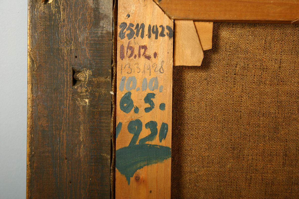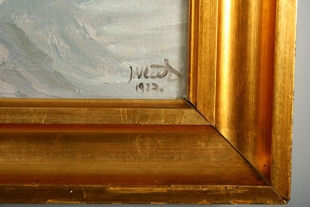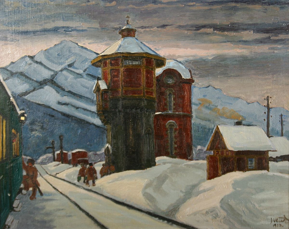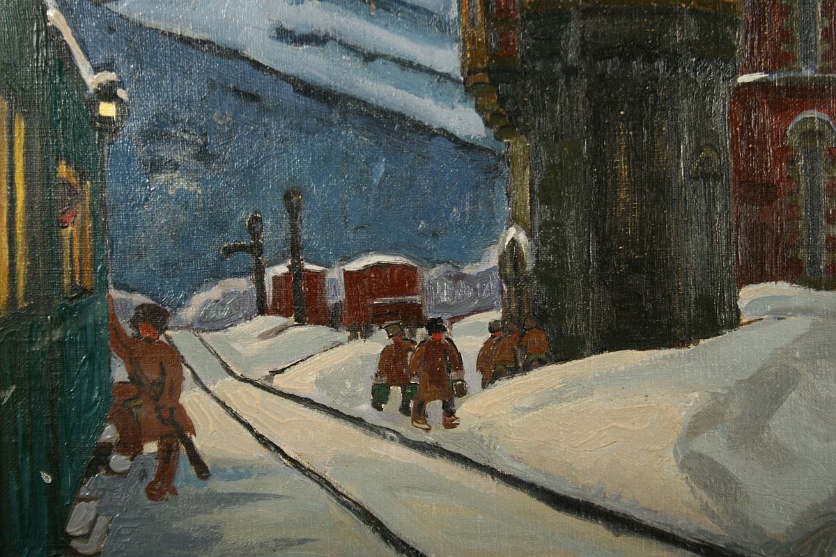 legionáři nastupující do vlaku v zasněžené krajině Zakarpatské Rusi, olej na plátně, ve výřezu 58,5 x 73,5 cm s rámem 76 x 91 cm, podepsáno vpravo dole J. Vlček, na zadní straně napínacího rámu je zaznamenáno několik dat,rámováno v původním částečně poškozeném rámu