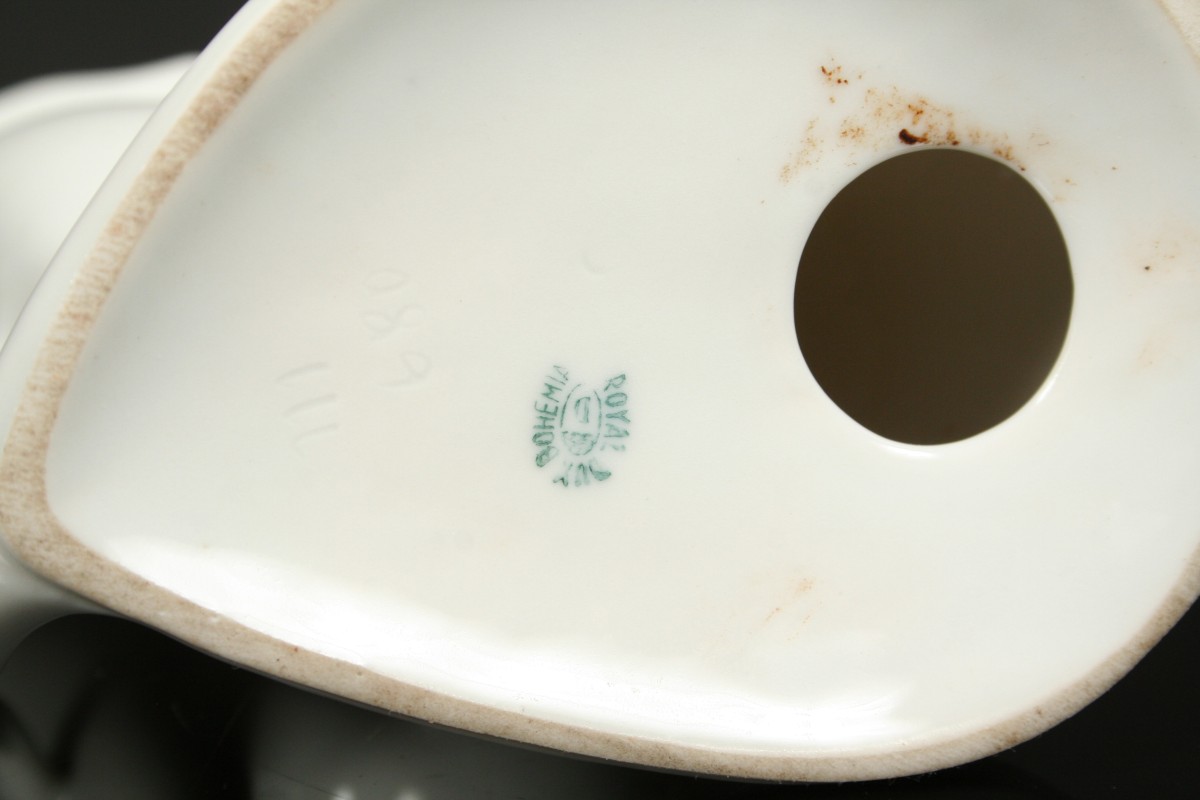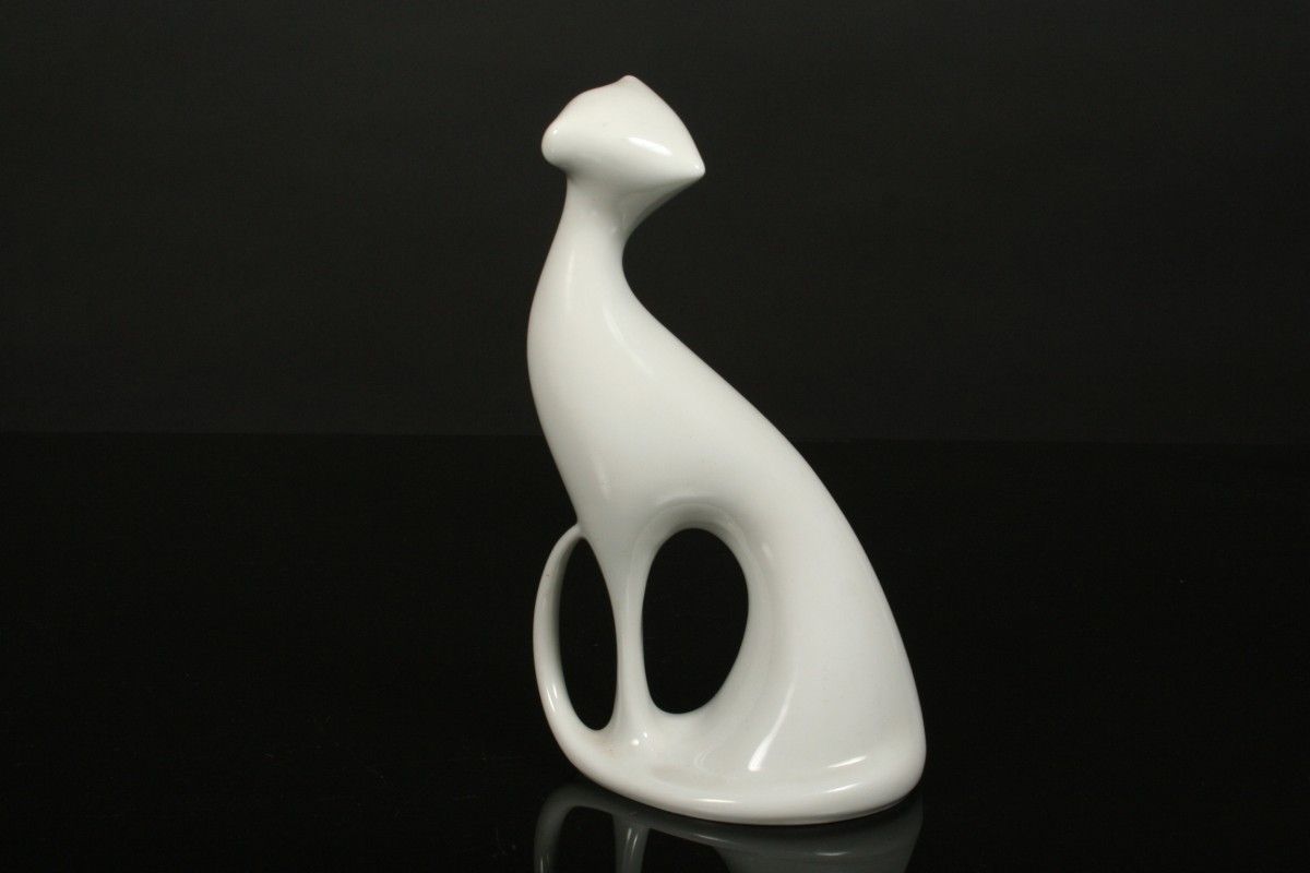 stylizovaná soška kočky, bílý glazovaný porcelán, autor návrhu Jaroslav Ježek, značená na dně starou tištěnou značkou Royal DUX Duchcov 60. léta 20. století, koncem 70. let se již tato značka nepoužívala, tzv bruselský styl, výška 19 cm