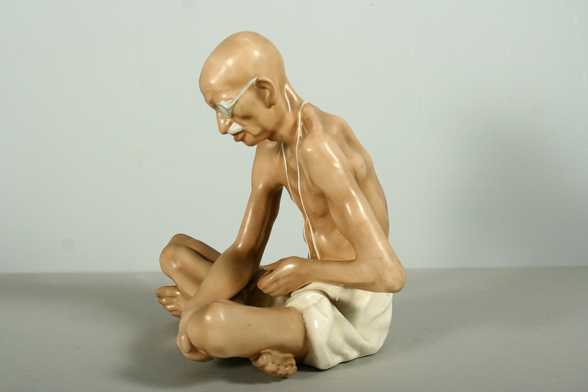 porcelánová socha Mahátma Gándhí, bílý porcelán malovaný pod glazůrou, značený tištěnou značkou Royal DUX Duchcov, 22 x 20 cm