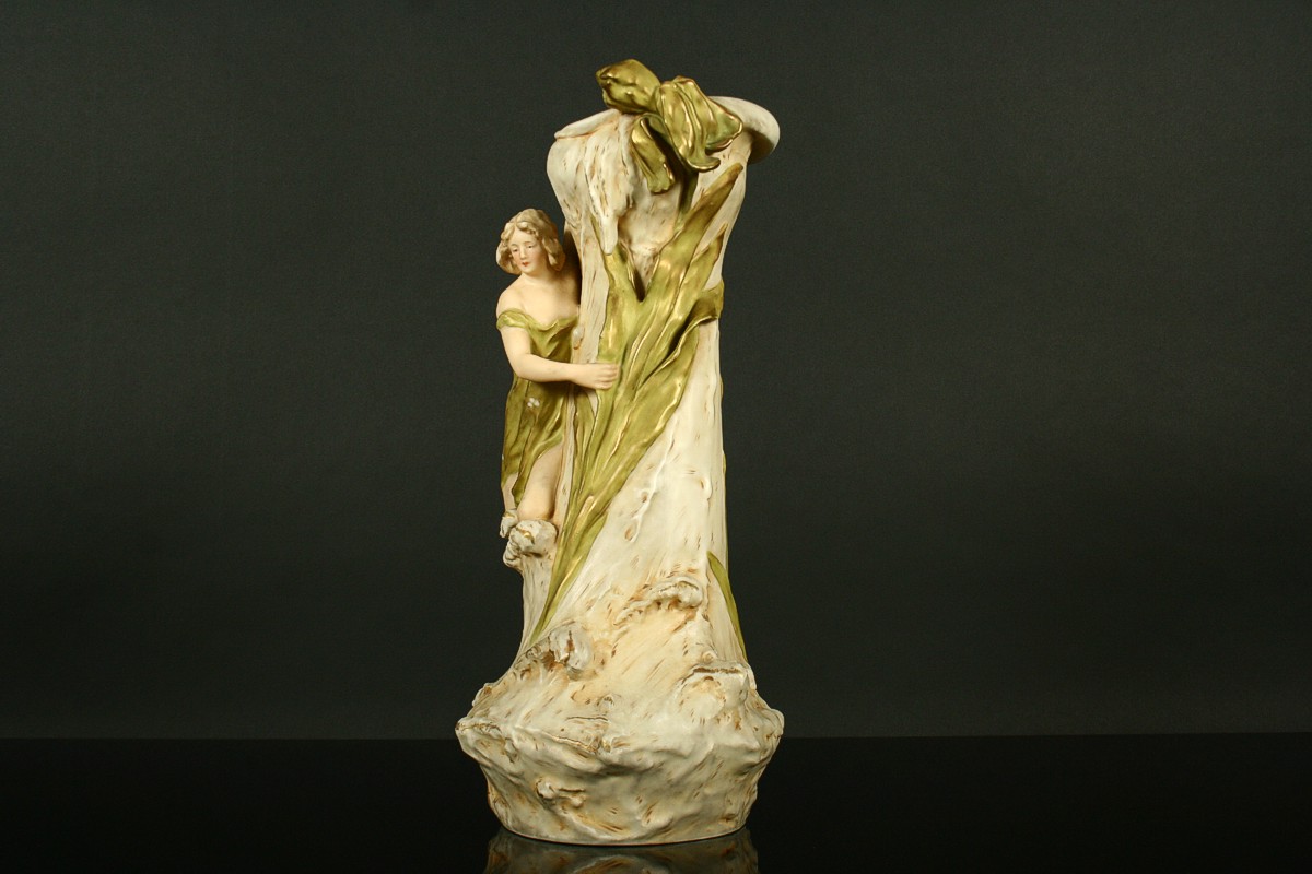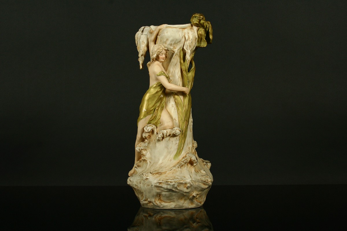 velká figurální váza, porcelán bílý malovaný v tělových barvách, částečně zlacený, značeno tištěnou a tlačenou značkou E ve velkém trojúhelníku Royal Dux Duchcov, 41 cm