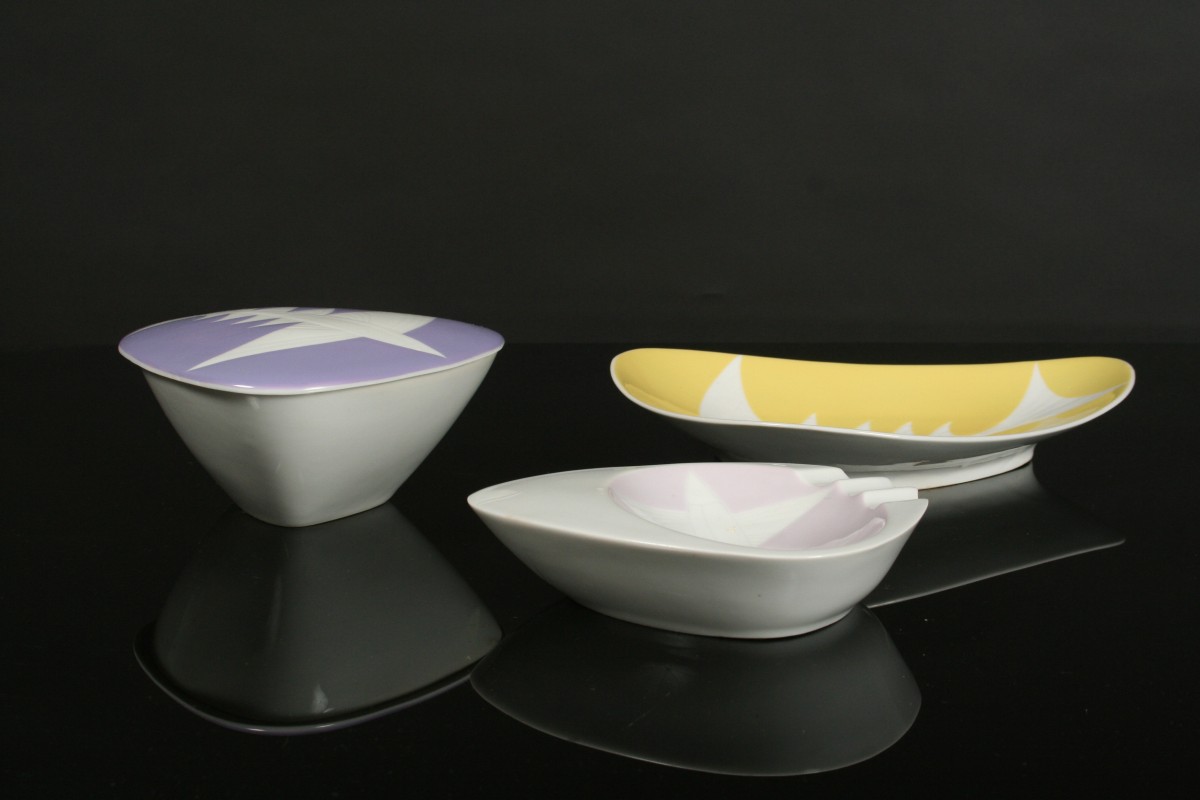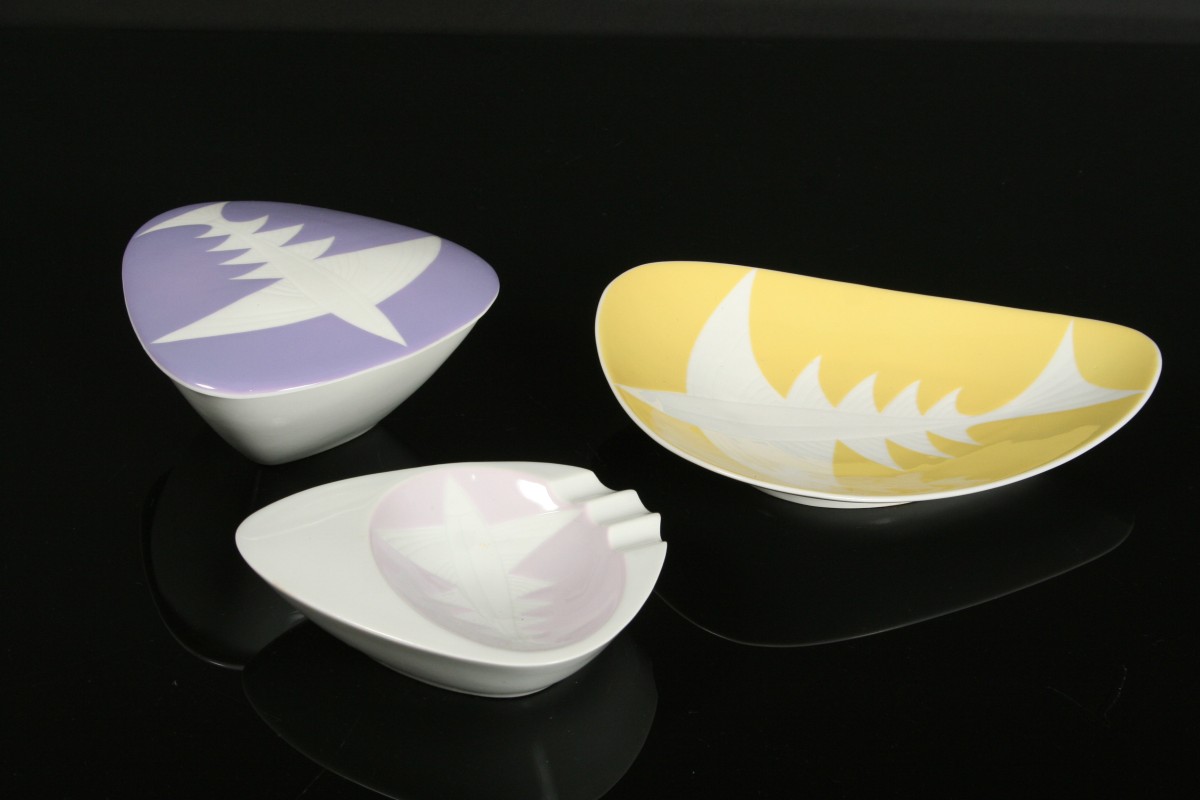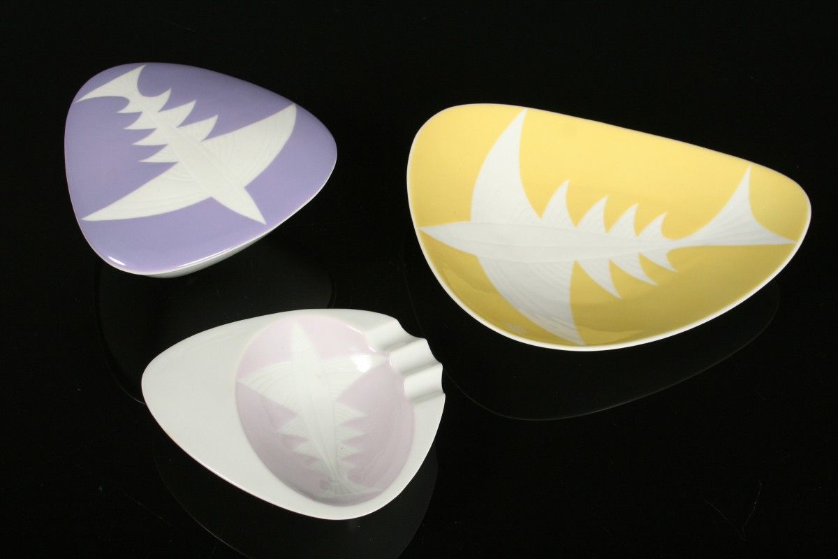 miska, dóza s víčkem a popelník nepravidelných tvarů s barevným dekorem a motivem ryby, 60. léta, značené Royal Dux, 22, 15 a 15 cm