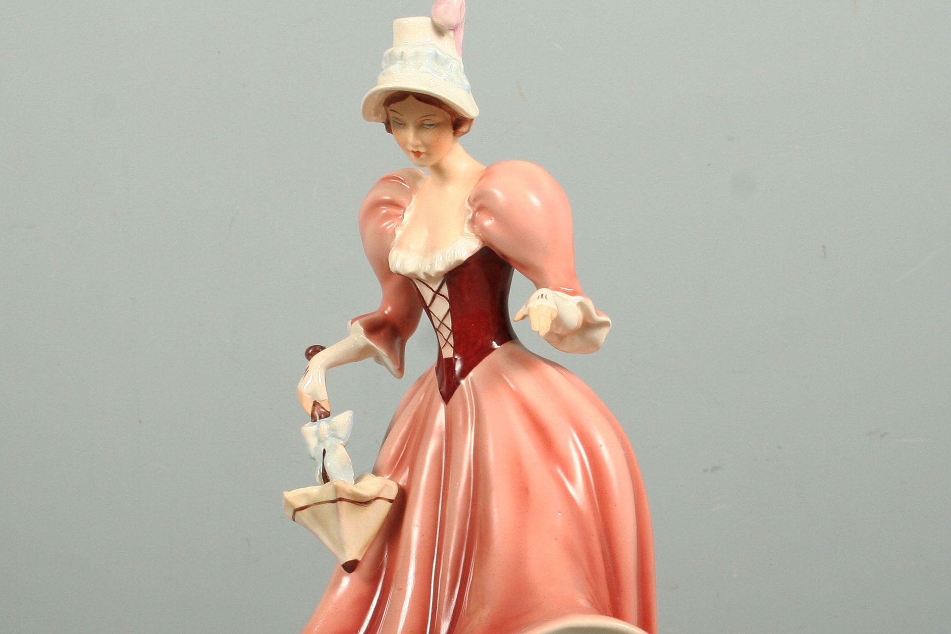 dáma v kloboučku a šatech s paraplíčkem v ruce, malovaná a glasovaná keramika, elegantní provedení, značeno na dně zeleným razítkem Royal DUX Deutschland, 31 cm
