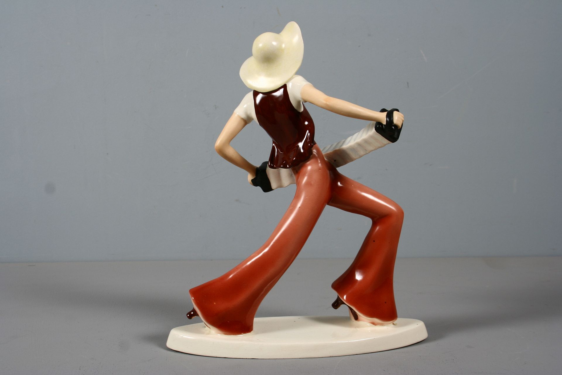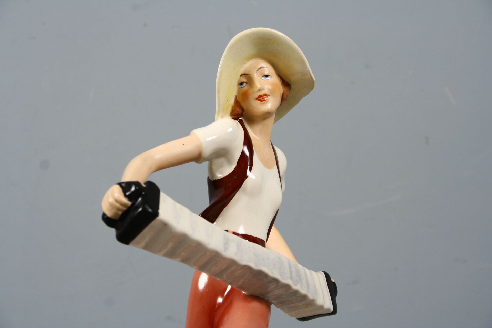 dívka v klobouku kráčející s harmonikou, malovaná a glasovaná keramika, elegantní provedení, značeno na dně zeleným razítkem Royal DUX Deutschland, 28 cm