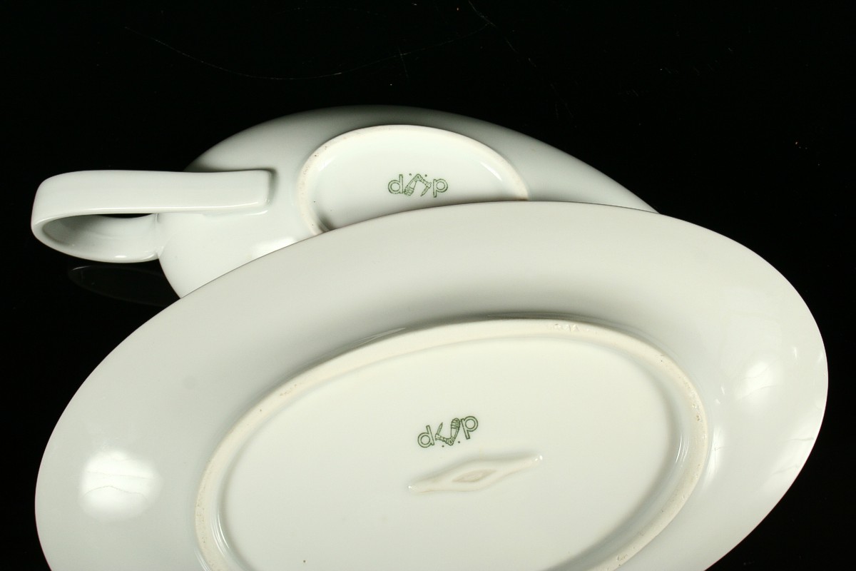 omáčkovník k jídelnímu servisu od známého autora českého designu Ladislava Sutnara, z bélého tenkého porcelánu s črvenou linkou po obvodu, značeno tištěnou značkou DP Loket