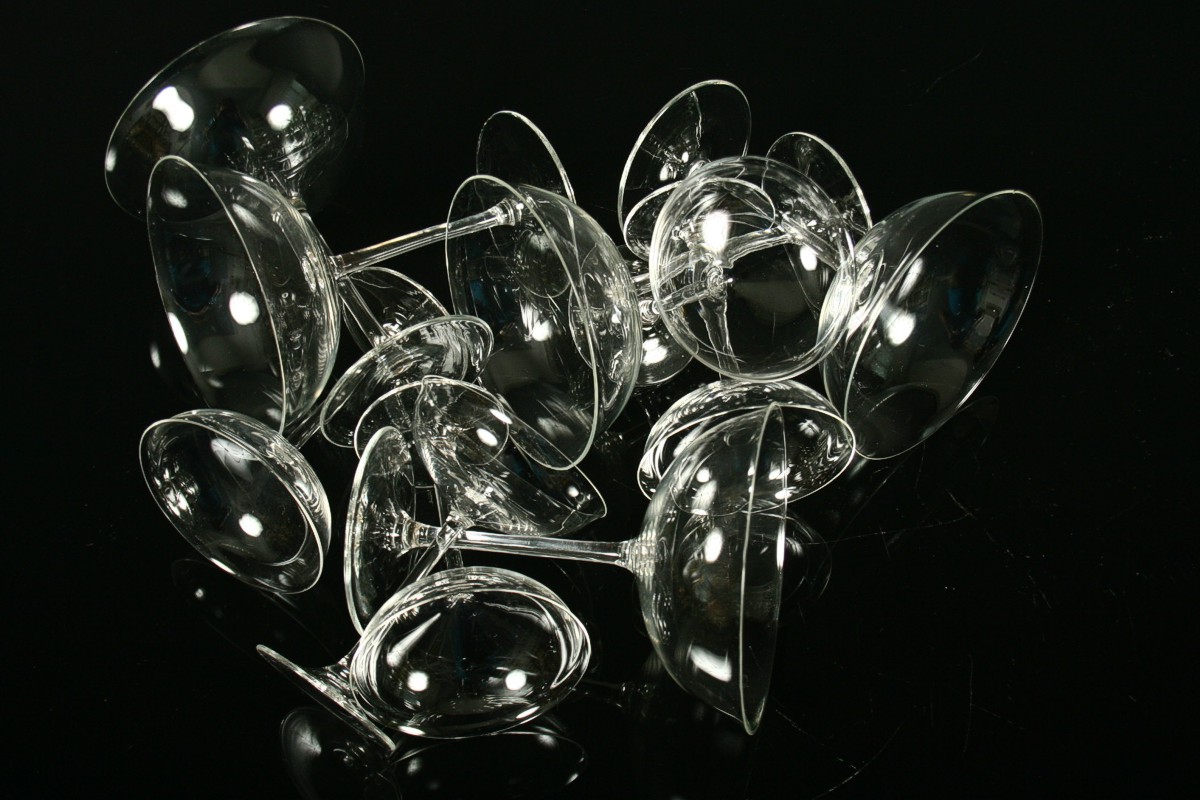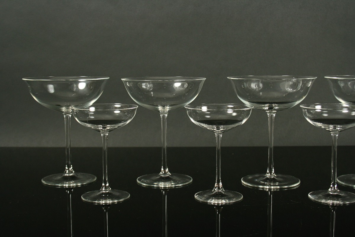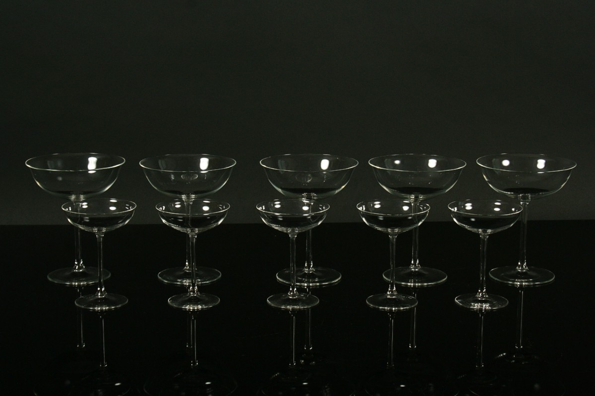 skleněný nápojový servis od známého autora českého designu Ladislava Sutnara, 5 x sklenice na sekt a 5 x sklenice na likér z bélého tenkého skla, jedna likérka má vlas, 10 a 12,5 cm