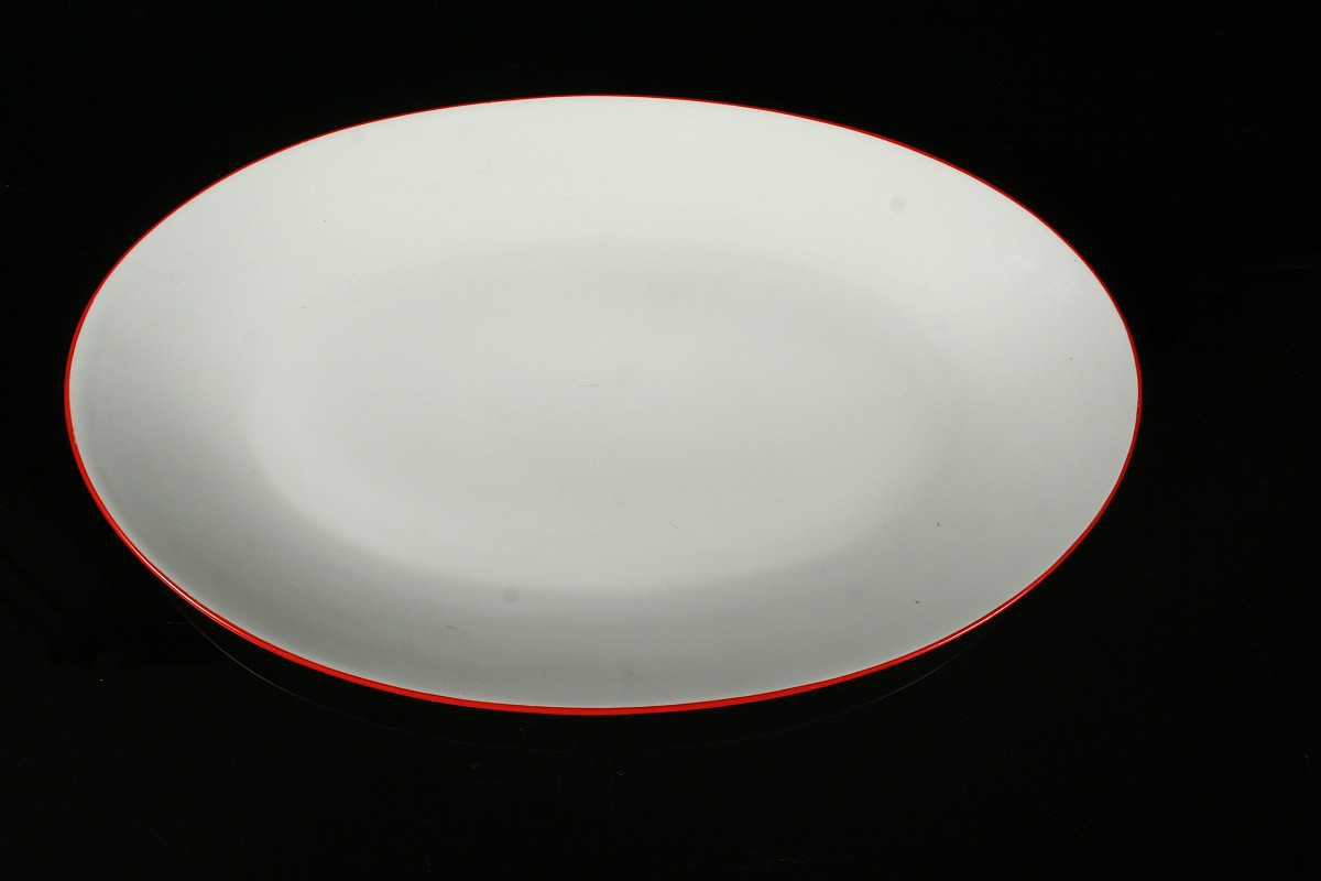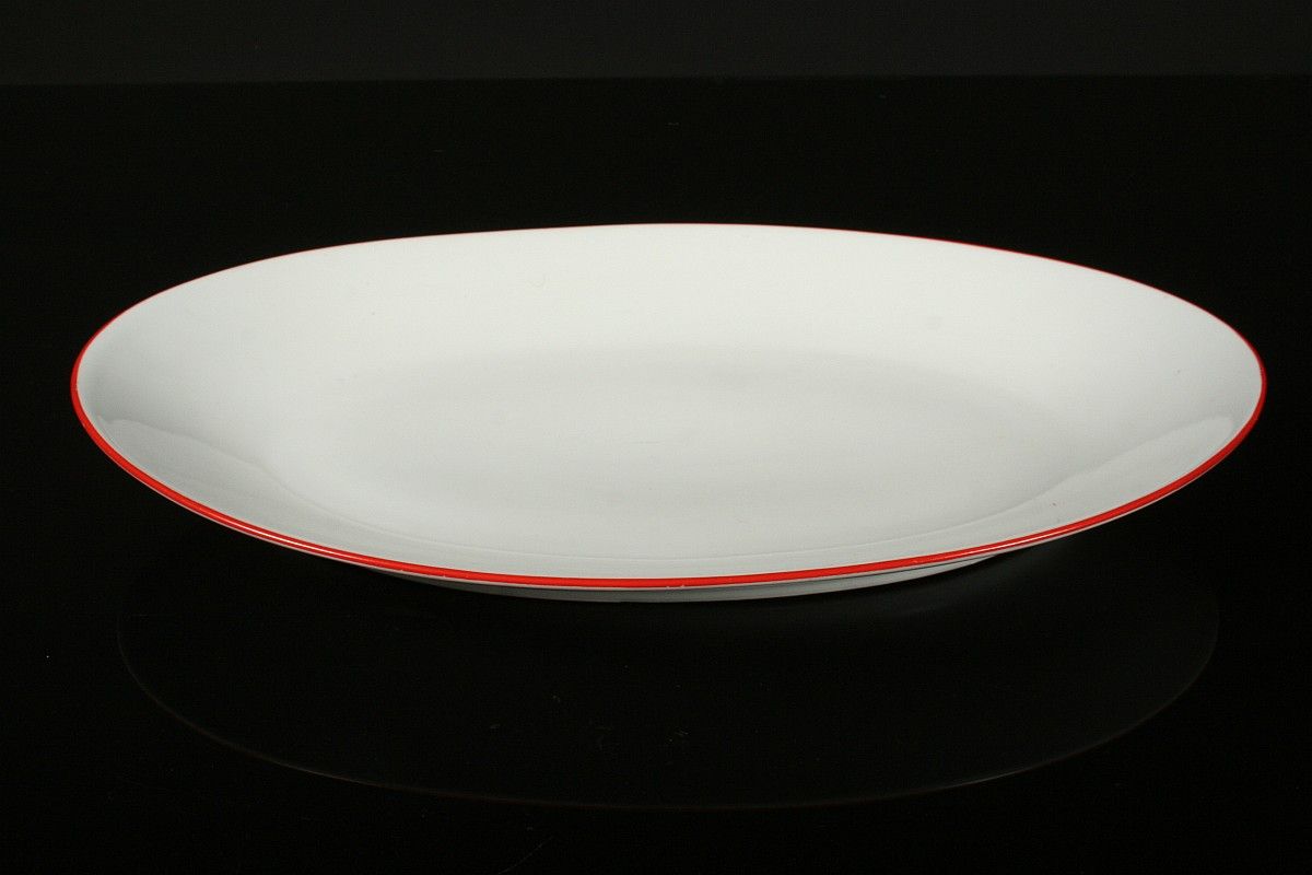 velký oválný talíř na rybu k jídelnímu servisu od známého autora českého designu Ladislava Sutnara, z bélého tenkého porcelánu s črvenou linkou po obvodu, značeno tištěnou značkou DP Loket, 40 x 25 cm