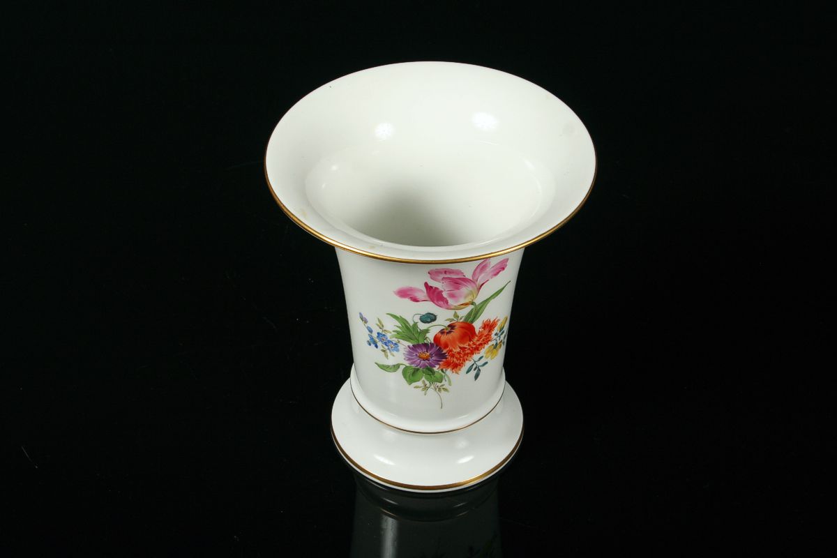 váza s pestře malovaným květinovým motivem a zlacenými linkami, malovaný zlacený bílý porcelán, 16,5 cm, na podstavě značená Míšeň modře pod glazurou znakem křížených kordů tlačenými čísly, a červeně pasanými 7306/154