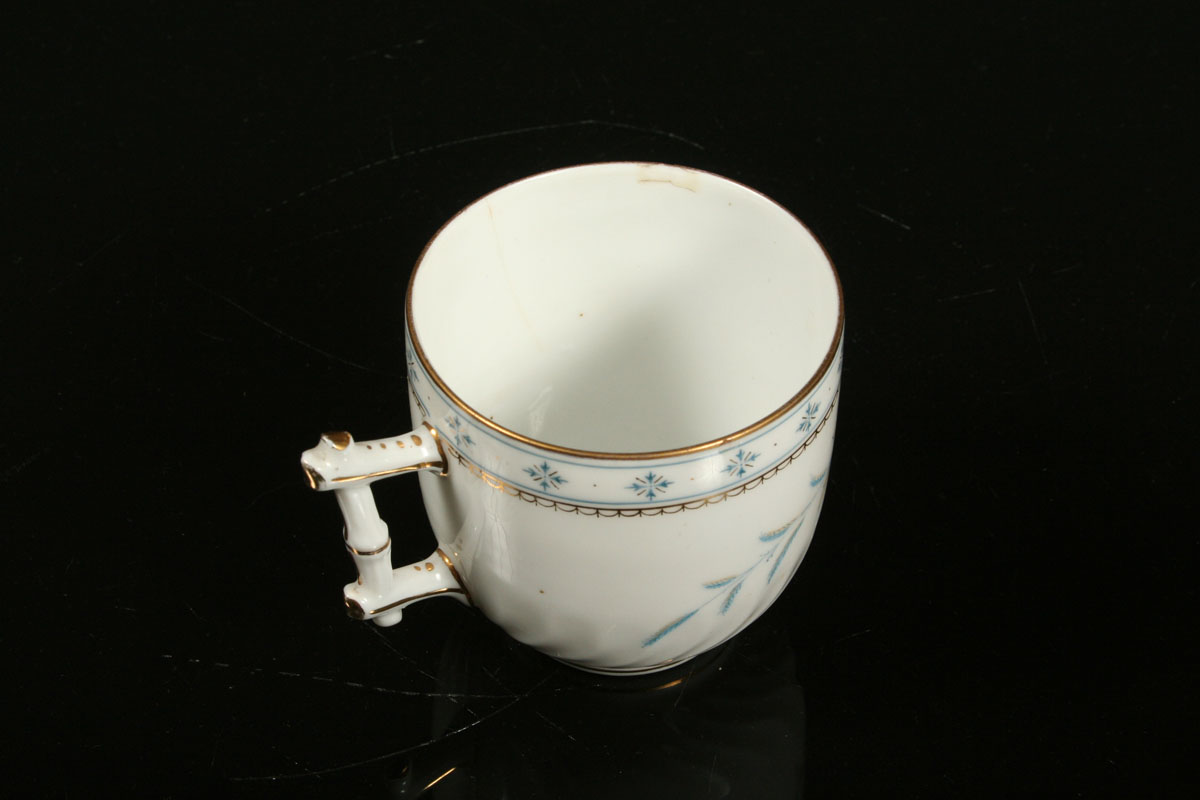 deseti osobní čajový / kávový servis s ručně malovaným florálním dekorem a zlacenými detaily, bílý porcelán, velká konvice s víčkem, menší konvice na mléko, cukřenka s víčkem, deset šálků s podšálky, značeno čísly a tlačenou značkou Loket z 19. století, výška konvice 22 cm, bez otluků, prasklé víčko konvice a vlas na jednom šálku viz foto (není okem téměř vidět)
