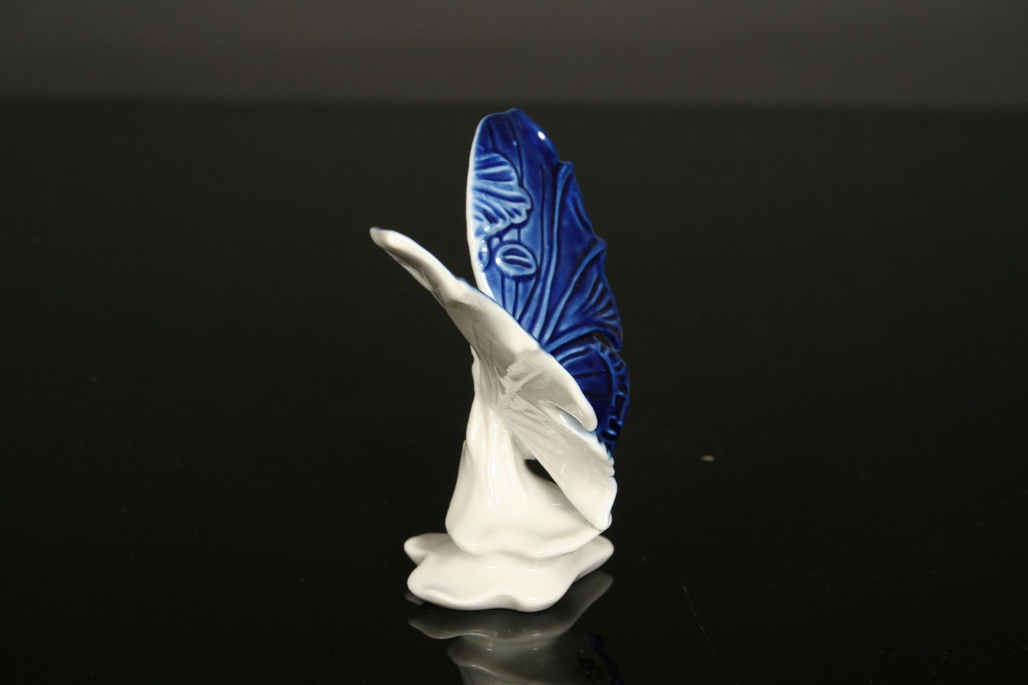 porcelánová soška motýla na čtyřlístku, bílý porcelán malovaný kobaltovou modří, značeno na spodní straně Volkstedt Karl ENS, 9 cm