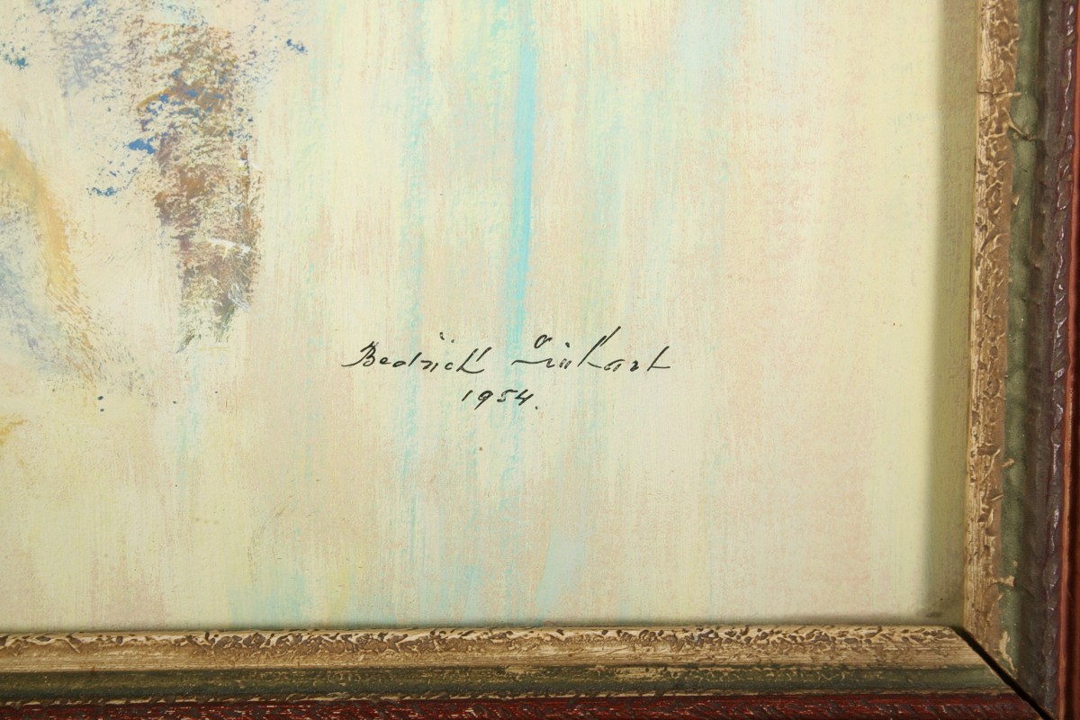 obraz lučních květin, olej na lepence, lepenka 39 x 49 s rámem 50 x 60 cm, autor Bedřich Linhart, podepsáno vpravo dole Bedřich Linhart 1954, vzadu autorský štítek s autodedikací, rámováno v původním rámu pod sklem