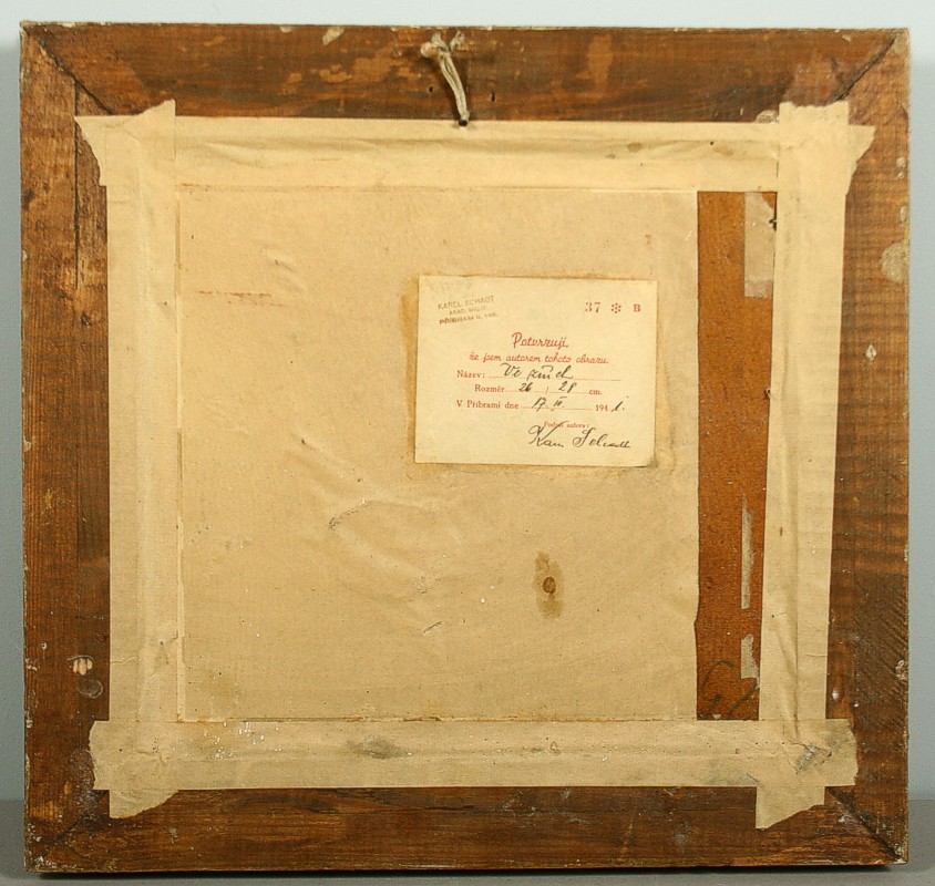 obraz hrabání slámy o žních, olej na plátně lepené na kartonu 26 x 28 cm s rámem 37 x 39 cm, autor Karel Schadt, pěkná svěží malba českého krajináře a žáka A. Kalvody na zadní straně autorský štítek s razítkem a vlastnoruční přípis, rámováno v původním rámu pod sklem