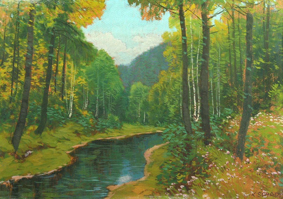 obraz letní krajiny s říčkou, olej na kartonu, 34 x 48 cm s rámem 50 x 64 cm, autor Karel Schadt, podepsáno vpravo dole K. Schadt, vzadu autorský štítek s dedikací, rámováno v původním zdobeném rámu