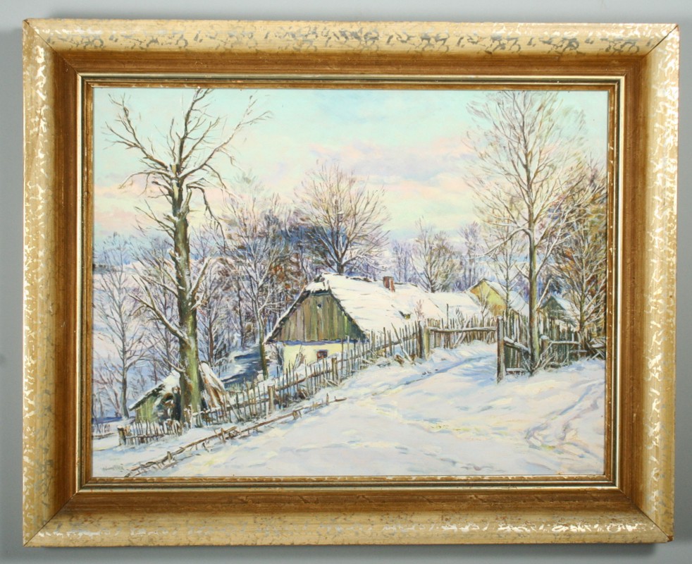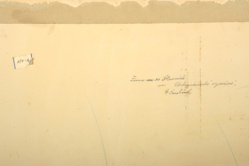 obraz chlupy v zimě ze Slavníče, olej na lepence 50 x 66 cm s rámem 66 x 82 cm, autor František Škrabánek podepsáno vlevo dole, bravůrní ukázka zvládnuté zimy v podání malíře Vysočiny a žáka prof. Engelmüllera, tento obraz je publikovaný na pohlednicích vydaných nákladem Fr. Riedla v Německém Brodě, na zadní straně autorský přípis a etiketa s číslem, rámováno pod sklem