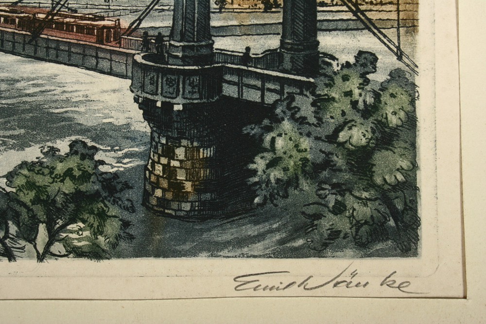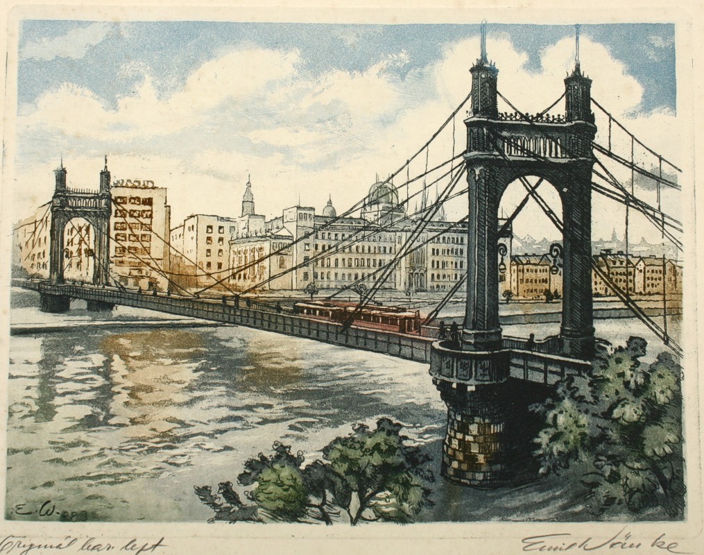 řetězový most v Praze, barevný lept na papíře, tisková plocha 21 x 27,5 cm autor Emil Wänke, podepsáno v desce E.W. a tužkou dole Emil Wänke, volný list v paspartě