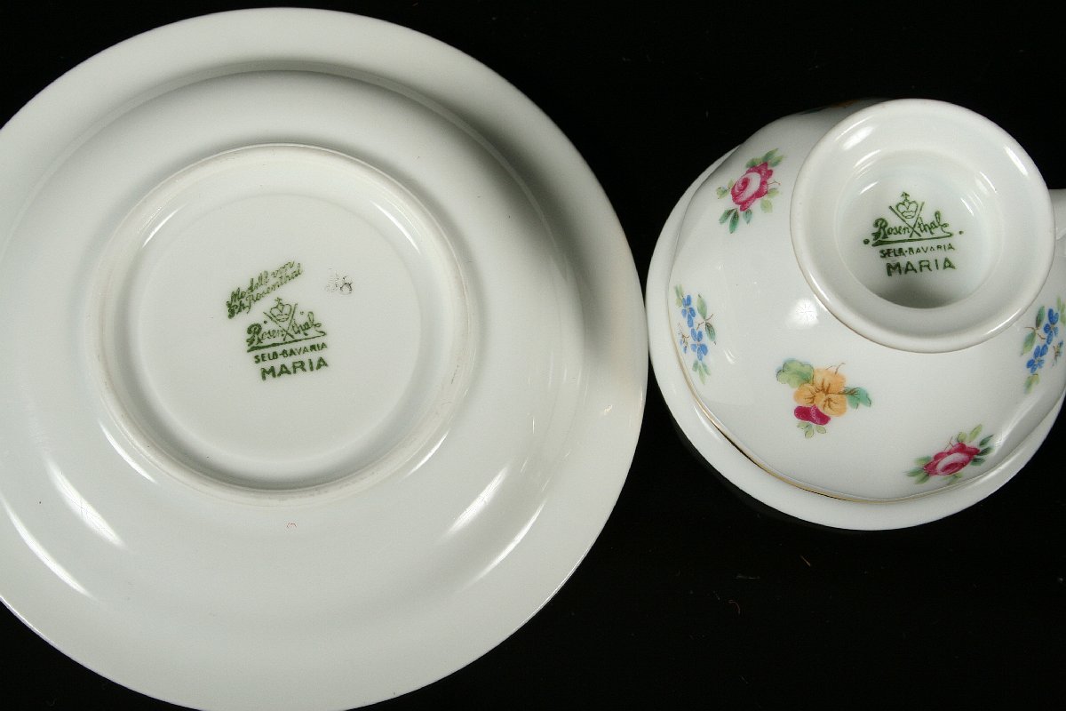 darovací moca šálek s projímaným podšálkem, bílý porcelán s dekorem květin a zlacenými detaily, značený tištěnou značkou Rosenthal, 4,5 x 10,5 cm