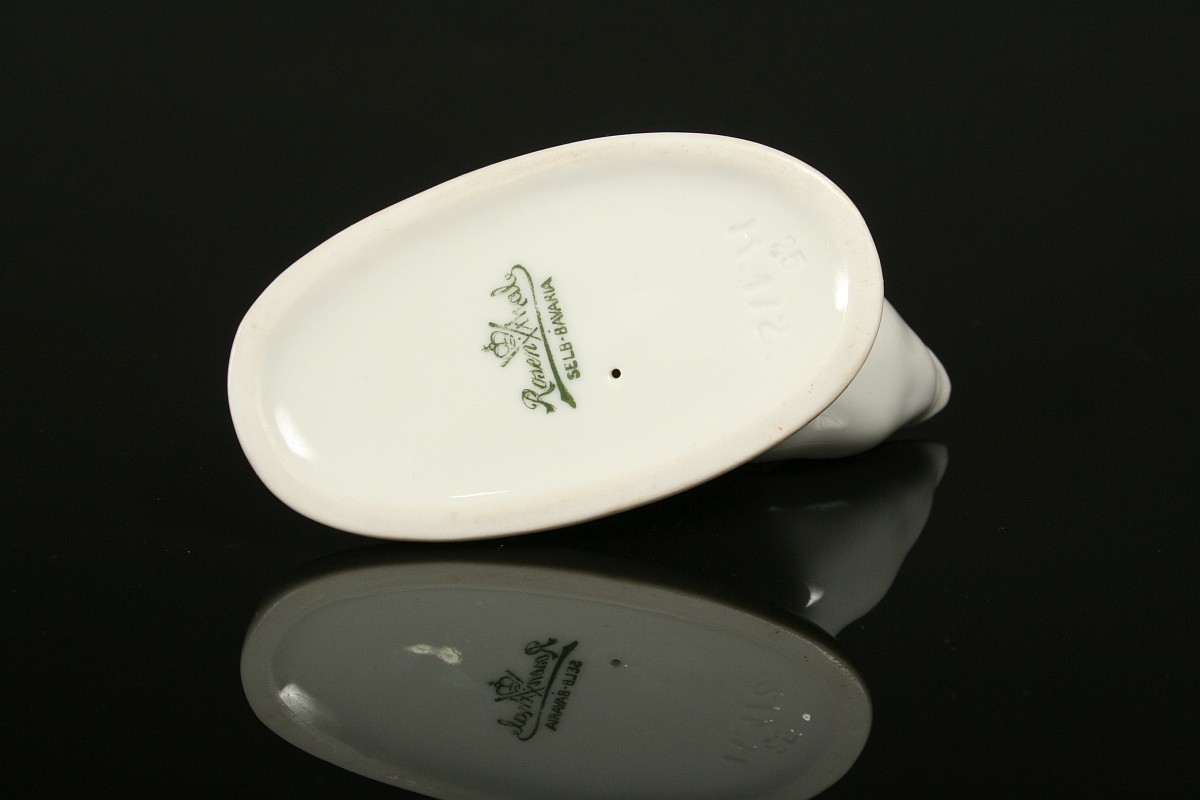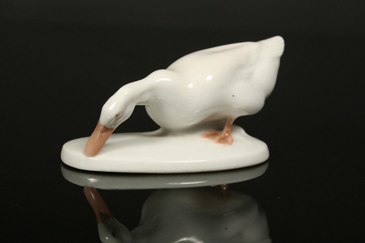porcelánová figurka domácí kačenky, malovaný porcelán na dně značený tištěnou značkou Rosenthal a tlačenými čísly, návrh číslo K. 172, autor K. Himmelstoss, 1. polovina 20. století, značeno na podstavci tlačené K. Himmelstoss, 5 x 10 cm, bez poškození v perfektním stavu