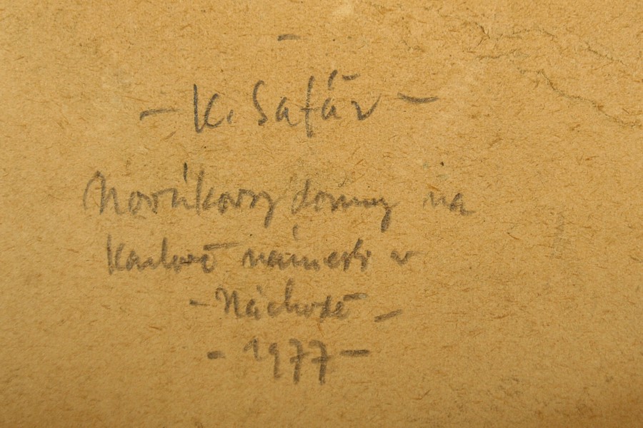 obraz Karlova náměstí v Náchodě, olej na plátně adjustovaném na kartonu, ve výřezu 20 x 31 cm s rámem 41 x 52 cm, autor Karel Šafář, podepsáno vlevo dole K. Šafář, na zadní straně autorský přípis s určením Novákovy domy na Karlově náměstí v Náchodě 1977, rámováno v paspartě a rámu pod sklem
