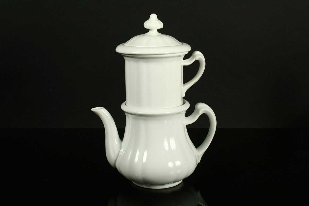 čajník porcelánová sestava konvice, sítko, louhovací odkapávač a víčko, bílý porcelán, značený tištěnou značkou Klášterec nad Ohří a číslem 3, výška 29 cm