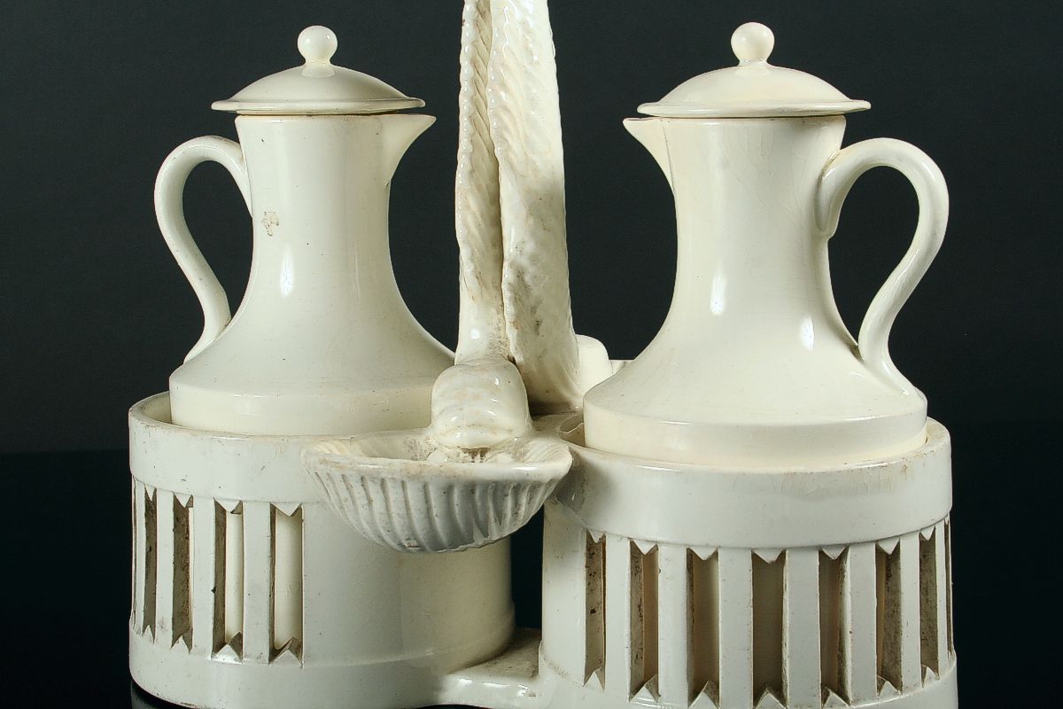 stolní souprava, úchyt ve tvaru dvou ryb držících v ústech slánky tvaru mušle s košíky na ocet a olej, bílá glazovaná keramika z 1. poloviny 19. století (kolem 1830), na dně značeno tlačenou značkou A N, A. Nowotny Stará role, 24 x 22 cm