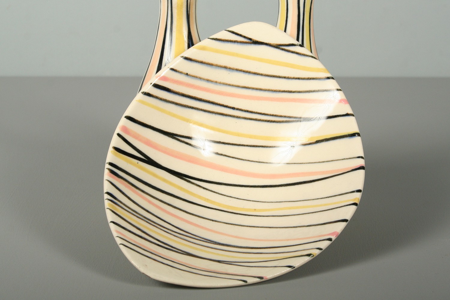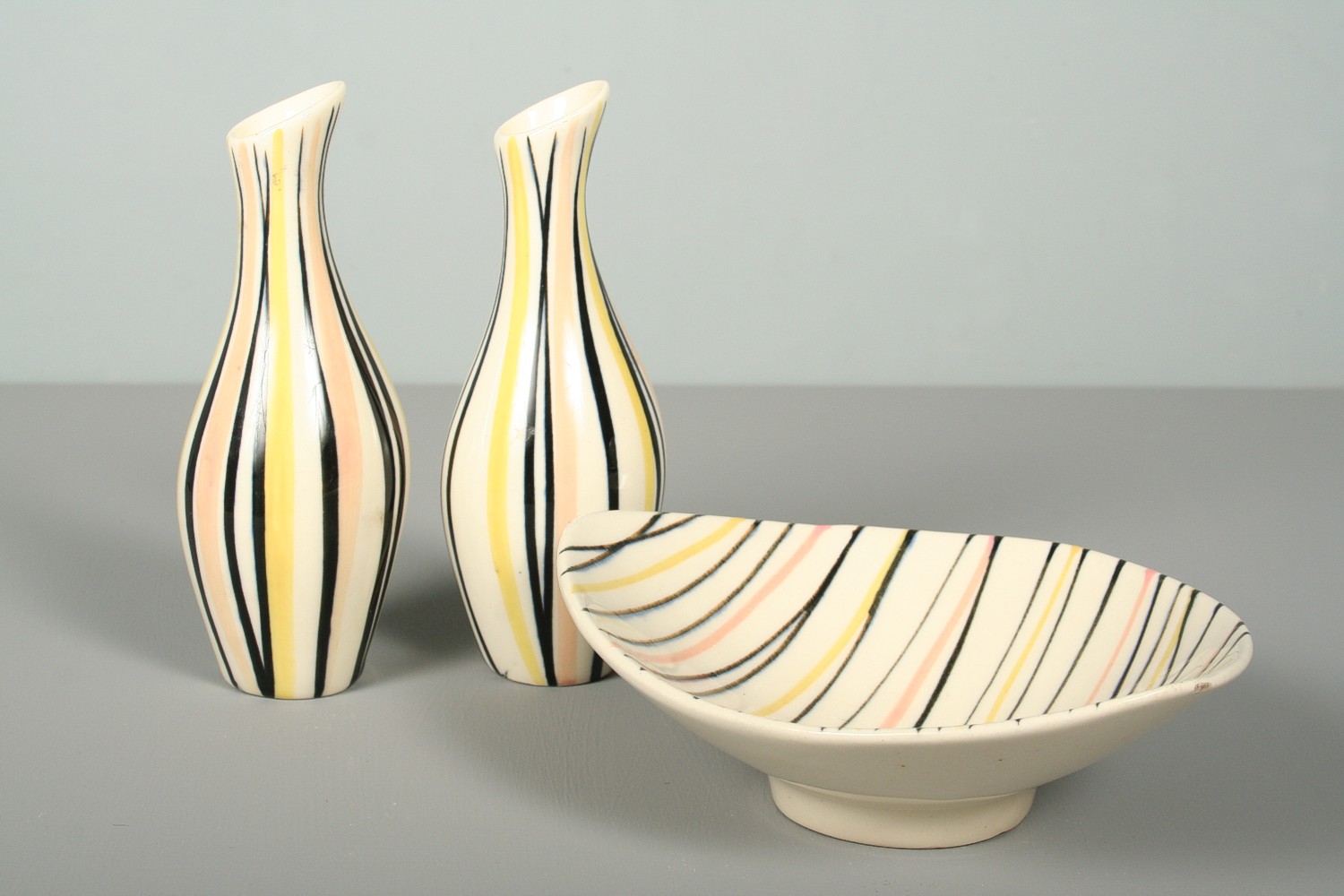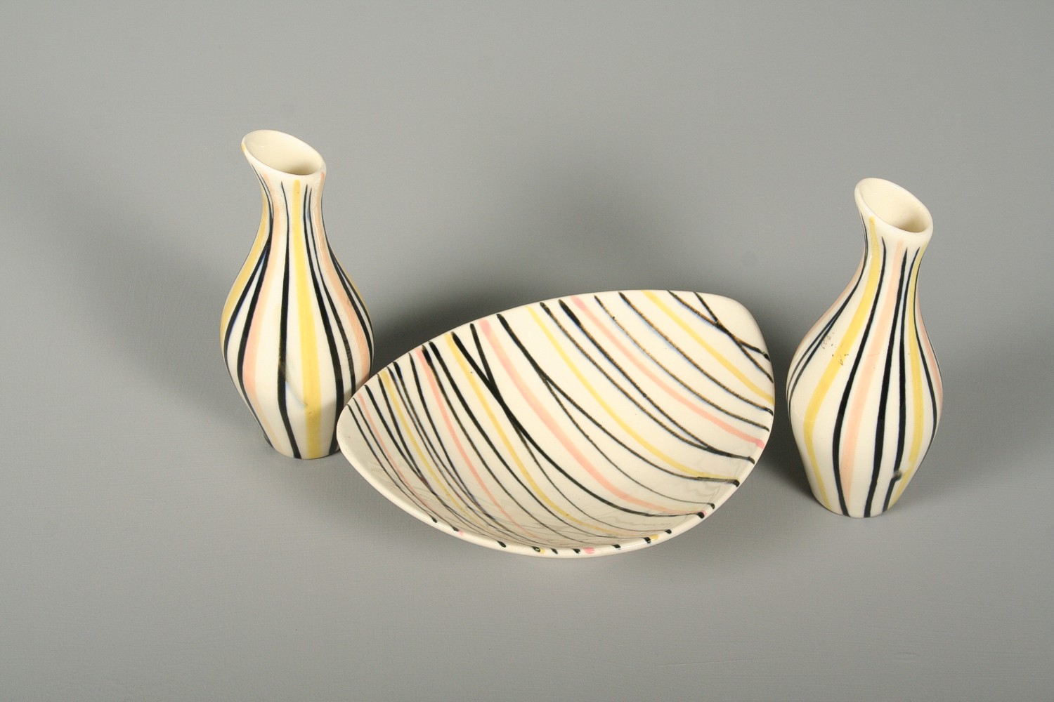 keramická miska a dvě vázičky na kvítka, dekorované barevnými linkami ve stylu 60. let, na dně značeno Ditmar Urbach, vázy 16 cm, miska 17 x 14 x 6 cm