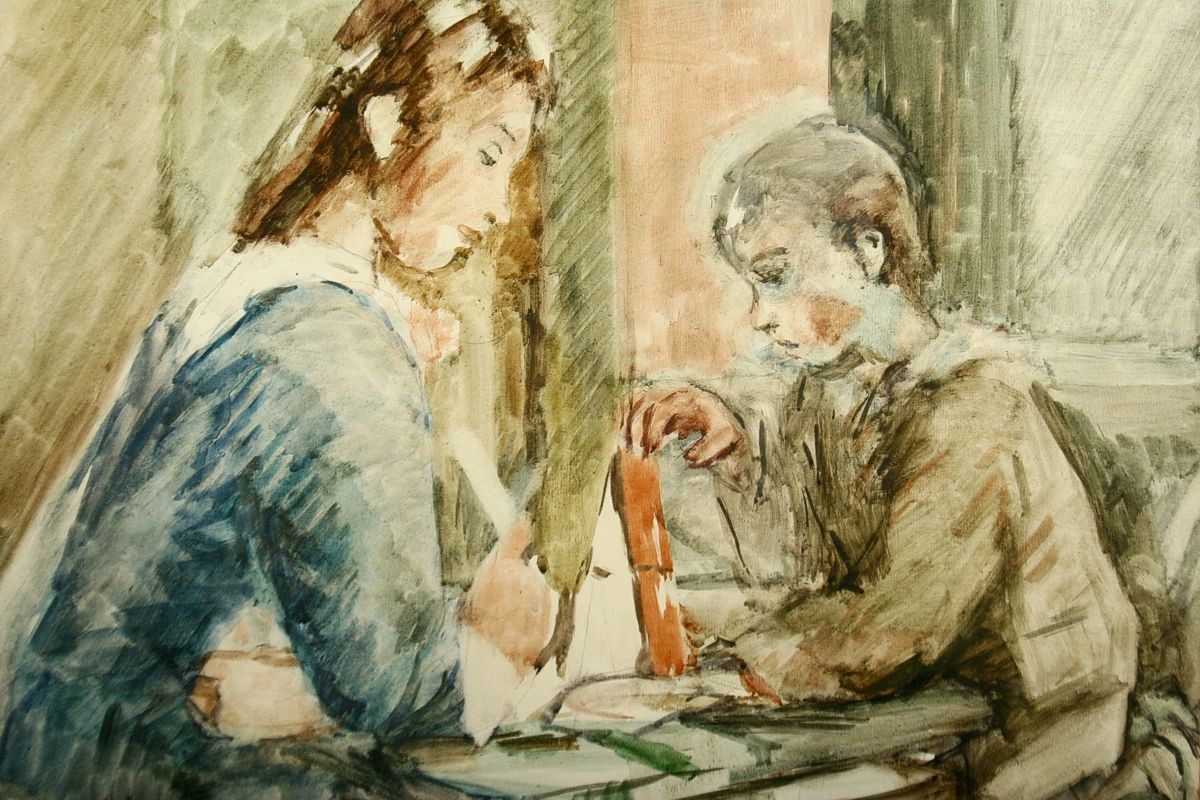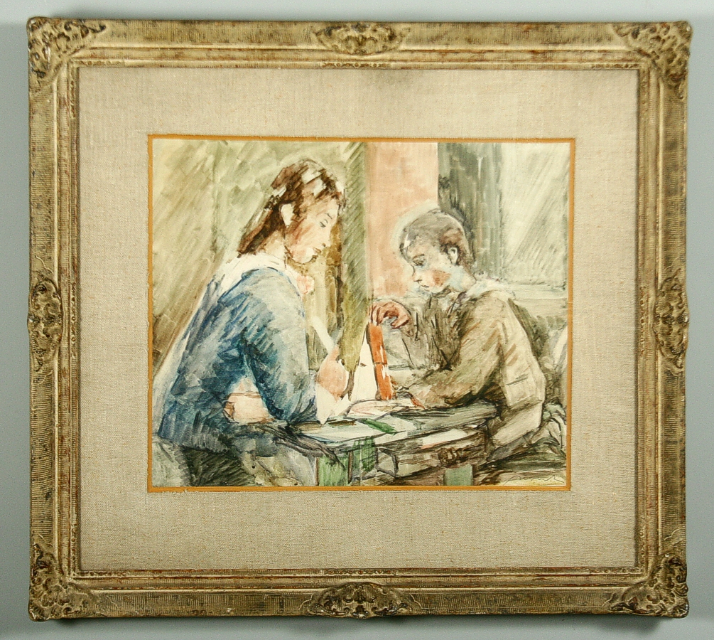 obraz mladé matky a syna, nebo sourozenců u stolu, akvarel na papíře, ve výřezu 38 x 46 cm s rámem 66 x 73 cm, autor Willy Nowak, podepsáno vpravo dole tužkou Nowak, na zadní straně přípis Dr. Borovička původní majitel zakoupil přímo ze sbírky Dr. Borovičky v 50. letech, rámováno v paspartě a půvdním zdobeném rámu pod sklem