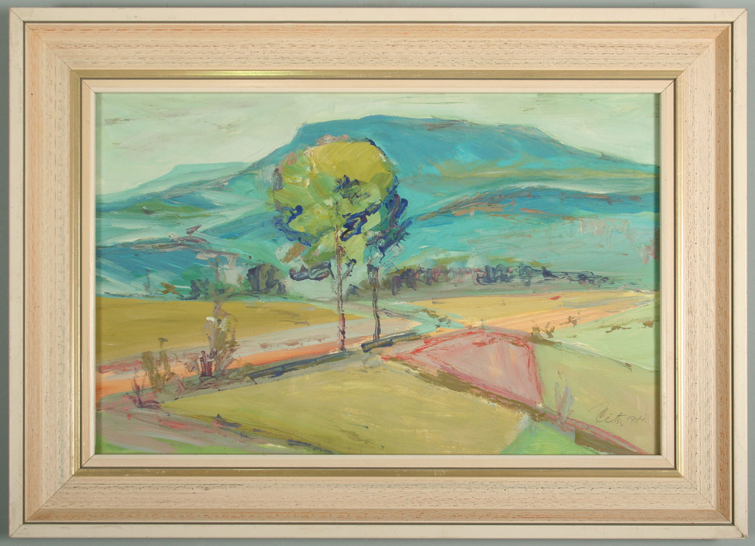 krajina s cestou a stromy pod Ostaší, olej na kartonu 28 x 43 cm s rámem 39 x 54 cm autor Jaroslav Cita, podepsáno vpravo dole J. Cita 1981, rámováno v původním rámu pod sklem
