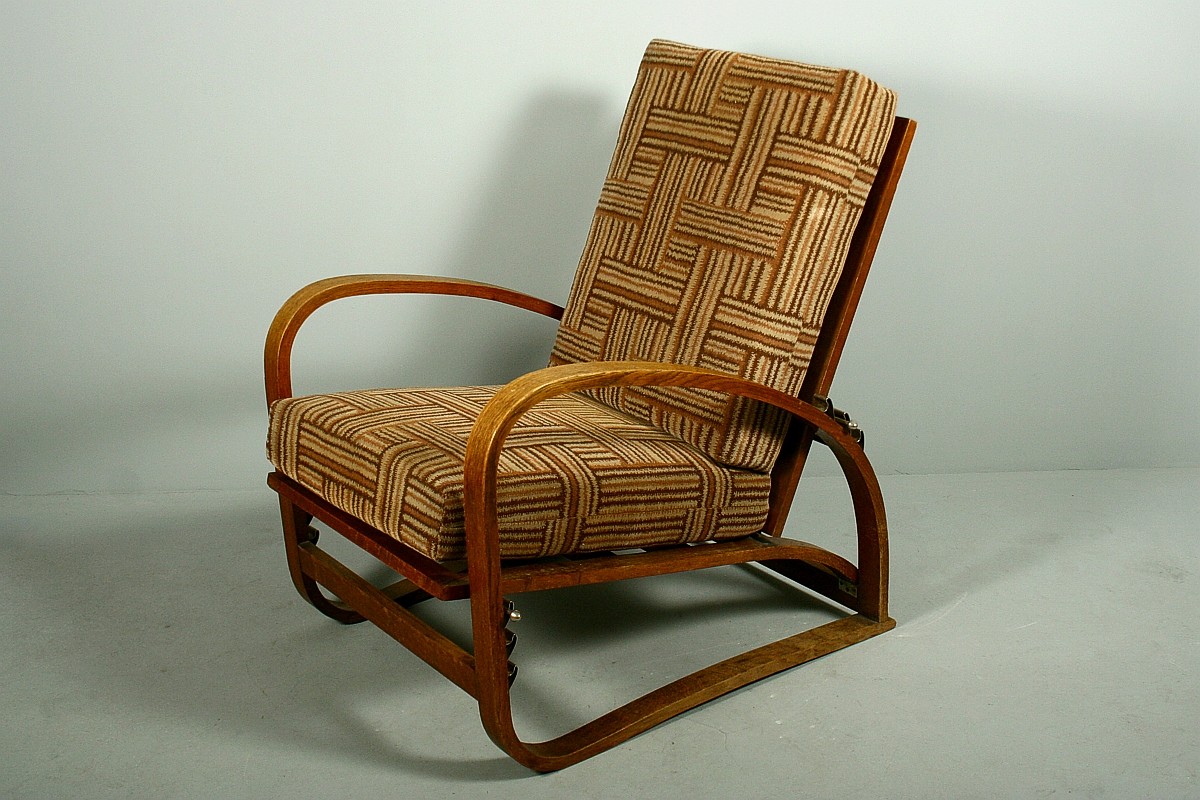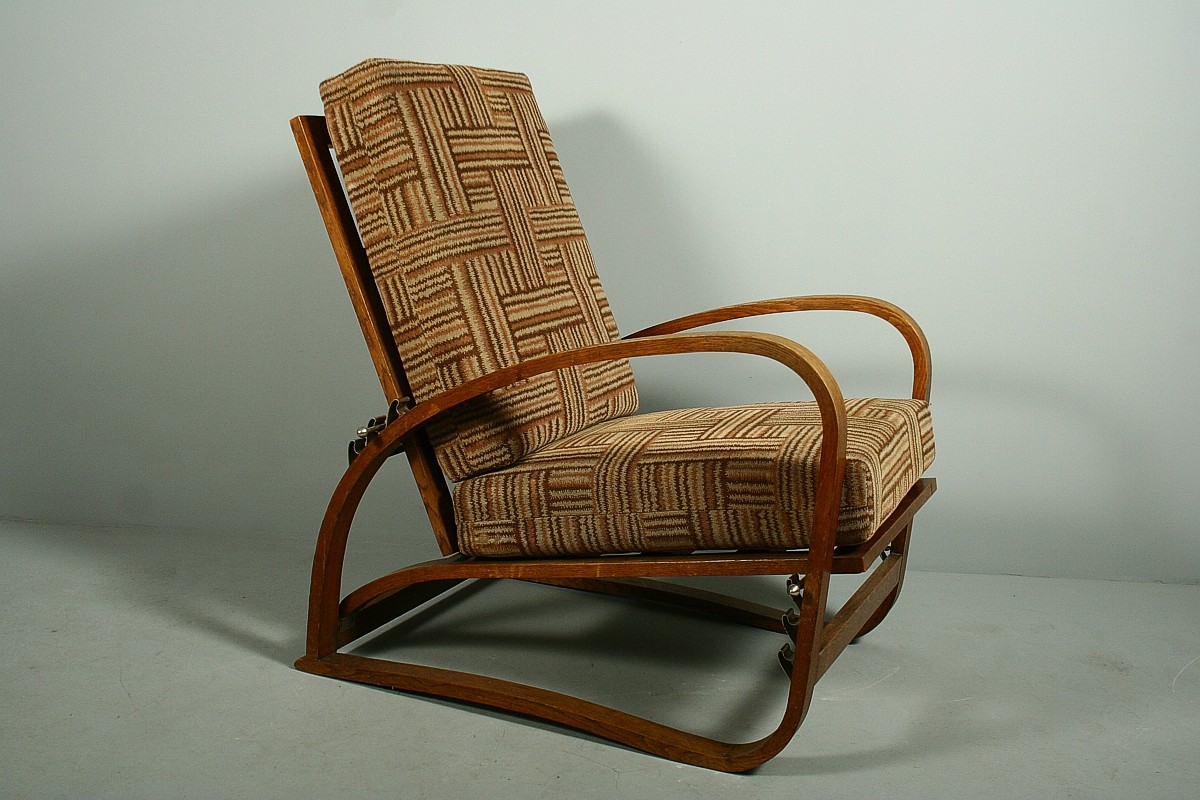 polohovací křeslo z ohýbaného dřeva, dýhované dubovou dýhou, polohovací sedák i opěrka, vše v pěkném původním stavu, originální chromové tyčky s původním zakončením, polstrování s původním, neroztrhaným potahem, ikona českého designu z 30. let 20. století