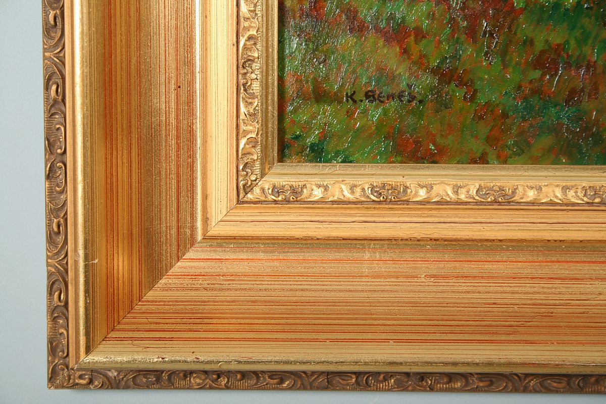 velký obraz, působivý pohled na náchodský zámek s kotlinou, olej na desce ze silného kartonu 68 x 95 cm s rámem 88 x 114 cm, autor Karel Beneš, podepsáno vlevo dole K. Beneš na zadní straně přípis s věnováním z roku 1925, rámváno
