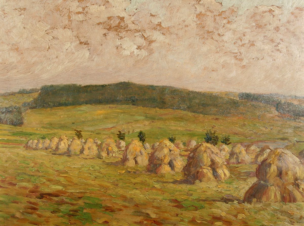 obraz letní krajiny s panáky a lesem, olej na kartonu 32 x 43 cm s rámem 42 x 54 cm, autor Karel Beneš, podepsáno vpravo dole K. Beneš a na zadní straně autorský přípis 1916, rámováno