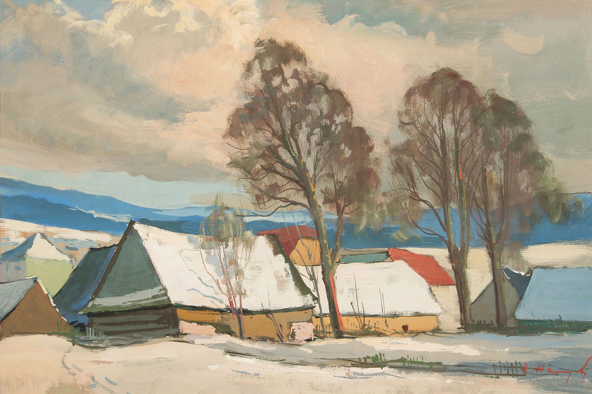 obraz zimní krajiny z Vysočiny s chlupami, olej tempera na papíře, ve výřezu 31 x 41 cm, s rámem 54 x 63 cm, autor Rudolf Hanych, podepsáno vpravo dole R. Hanych, rámováno v půvdní paspartě a zdobeném rámu pod sklem