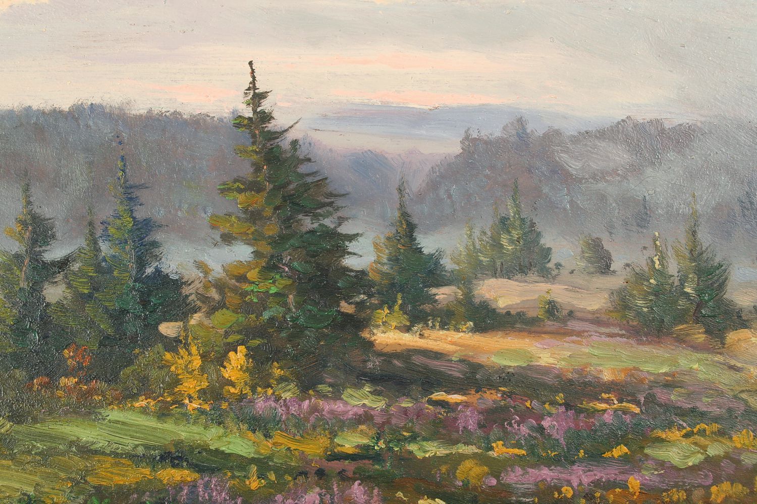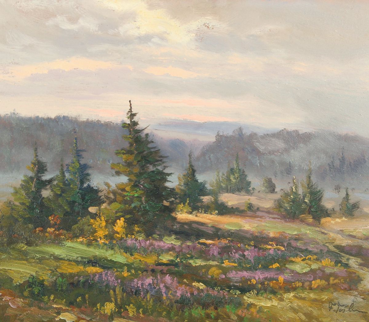 obraz krajiny u Nové Paky s vřesovištěm a červánky, olej na lepence, 30 x 34 cm, s rámem 46 x 50 cm, autor Ferdinand Tásler, podepsáno vpravo dole F. Tásler, rámováno v původním stříbřeném rámu