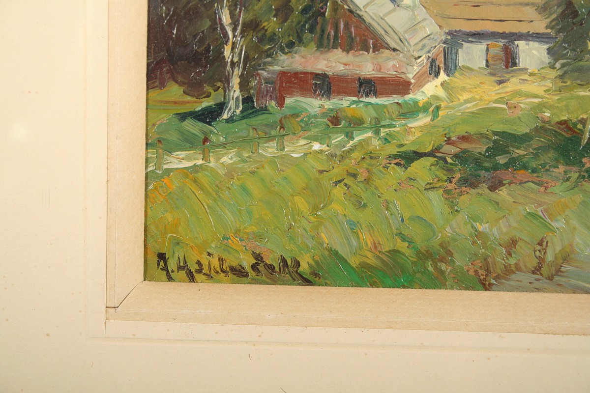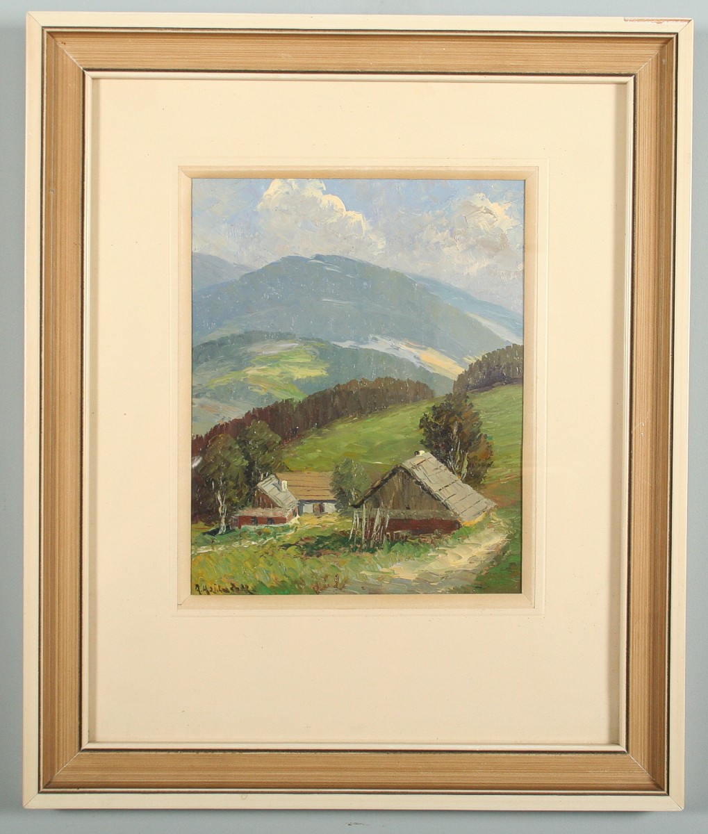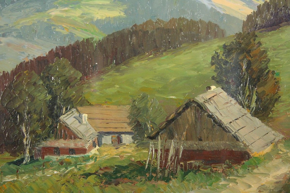 letní obraz chalup v Beskydech, olej na kartonu ve výřezu 26 x 21 cm, s rámem 49 x 41 cm, autor Adolf Hajduček, podepsáno vlevo dole A. Hajduček, rámováno v paspartě a rámu pod sklem