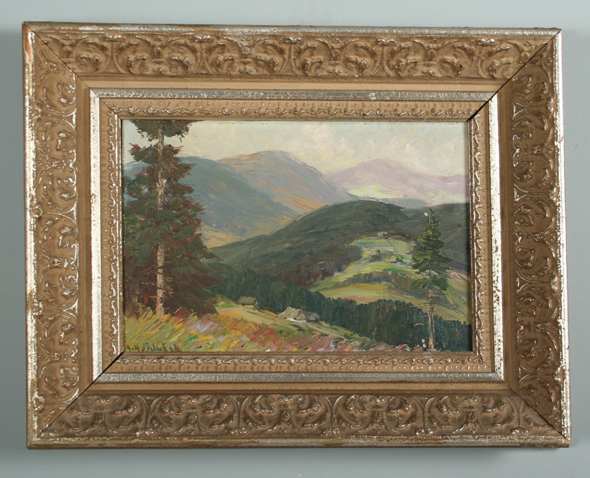 letní obraz Kněhyně z Lysé v Beskydech, olej na kartonu ve výřezu 19 x 28 cm, s rámem 34 x 43 cm, autor Adolf Hajduček, podepsáno vlevo dole A. Hajduček zezadu přípis s místem určení, rámováno v původním rámu pod sklem