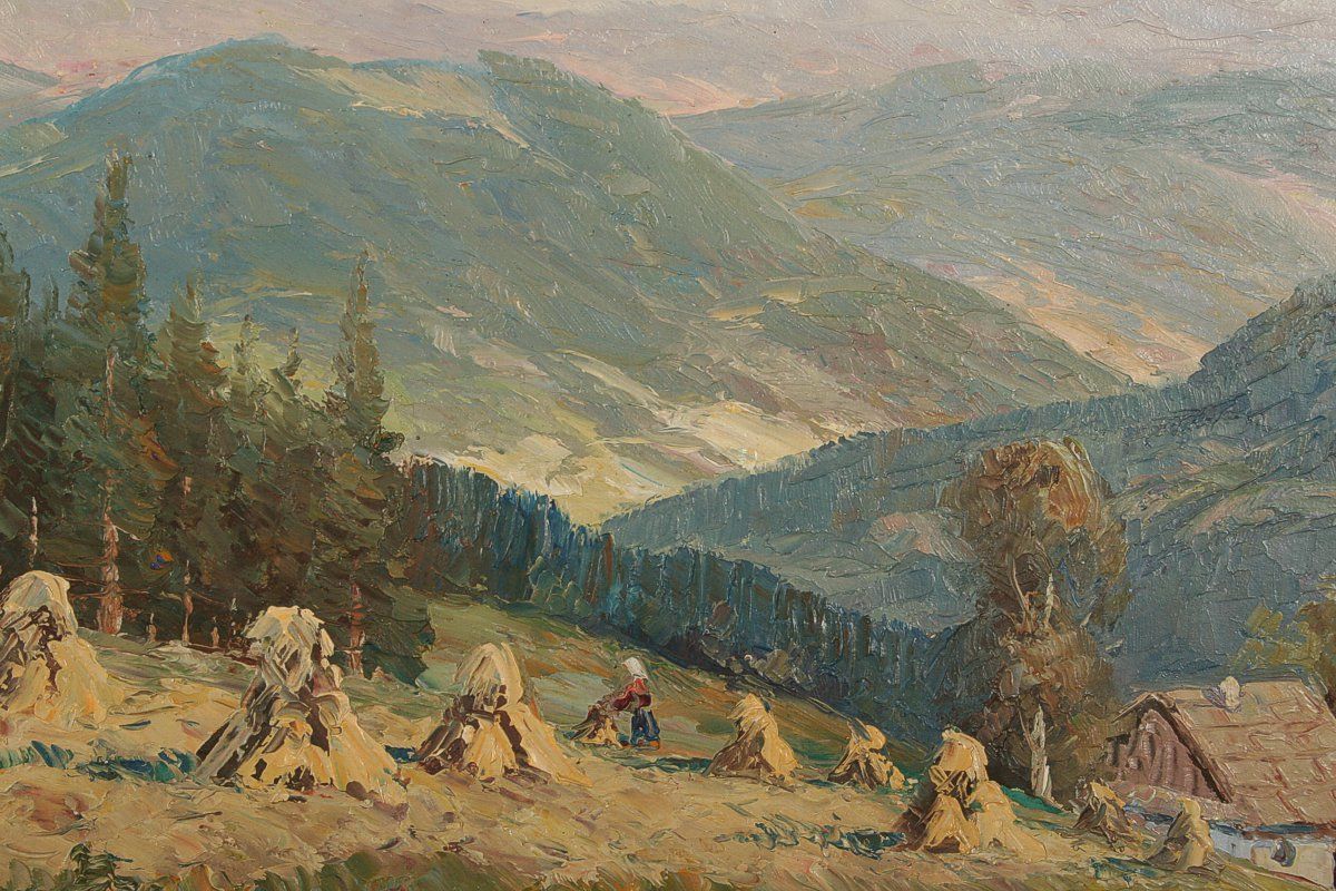 obraz letní krajiny s figurální stafáží na louce se snopy o žních v Beskydech, olej na lepence 25 x 34 cm, s rámem 35 x 43 cm, autor Adolf Hajduček, podepsáno vlevo dole špatně čitelně A. Hajduček zezadu přípis s určení Žně v Beskydech, rámováno v původním místy mšelém rámu
