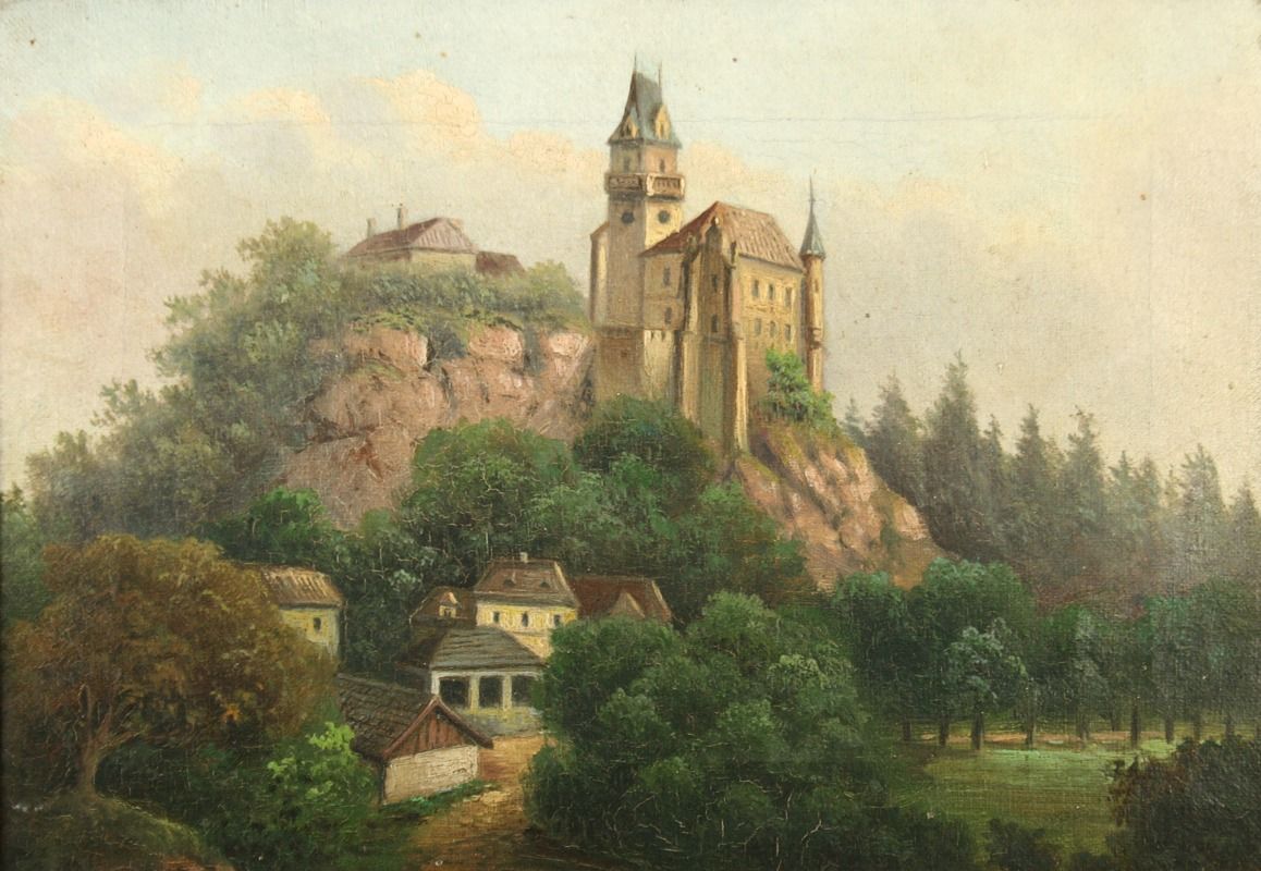 obraz hradu v zalesněné krajině s podhradím, olej na plátně, ve výřezu 19 x 27,5 s rámem 32,5 x 41,5 cm, konec 19. století, nepodepsáno, rámováno v původním lehce poškozeném rámu, párový obraz k druhé položce