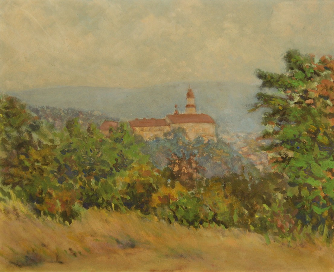 impresionistické ztvárnění náchodského zámku, olej na sololitové desce 40 x 49 cm s rámem 50 x 60 cm, autor neznámý, rámováno v částečně poškozeném rámu