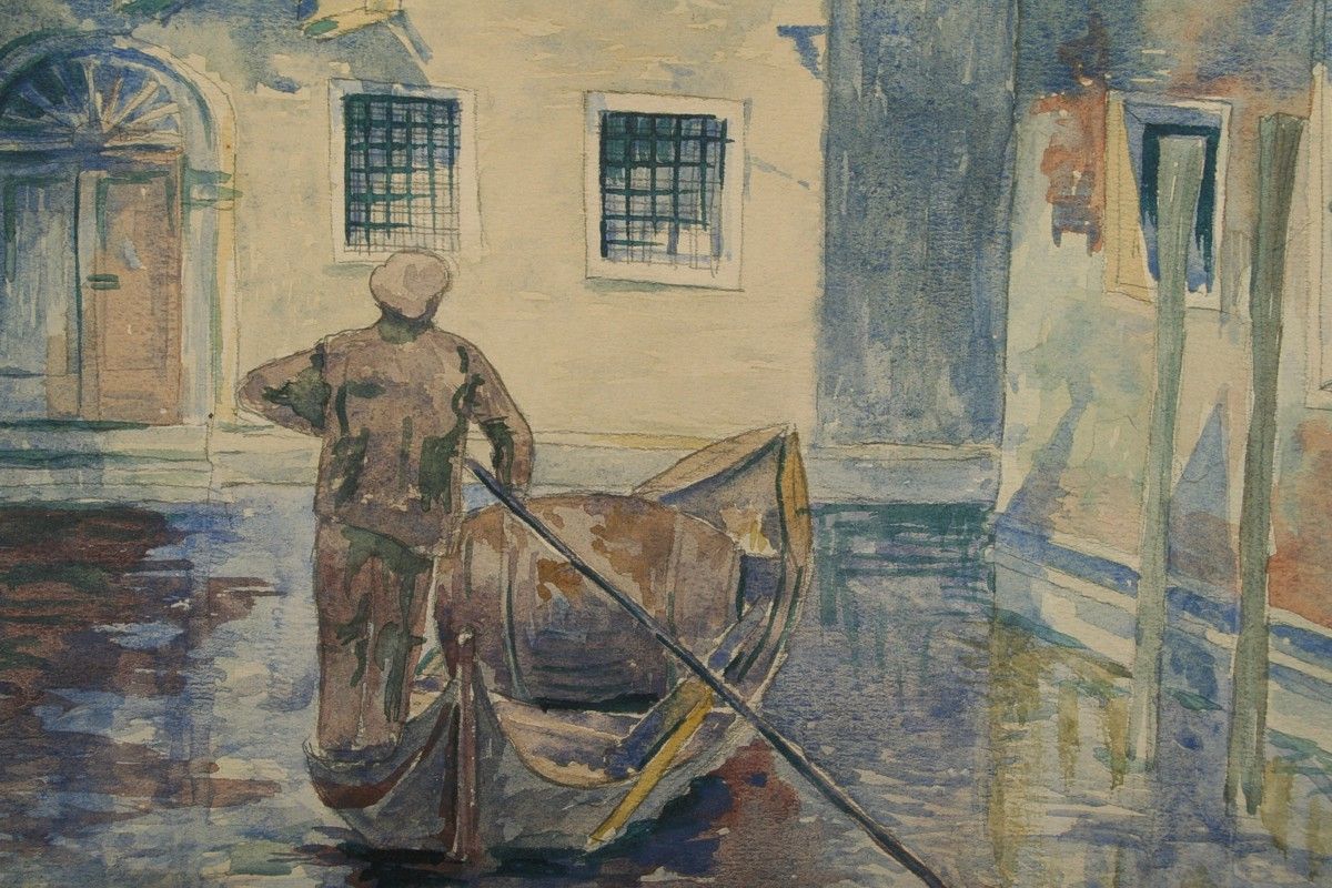 obraz gondoliéra v Benátkách akvarel na papíře ve výřezu 25 x 33 cm, s rámem 42 x 51 cm, autor neznámý nepodepsáno, obdobné akvarely z Benátek maloval Jaro Procházka, rámováno v původní paspartě a rámu pod sklem