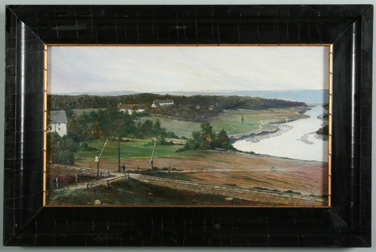 obraz široké krajiny s železničním přejezdem, závorami, architektůrou i figurální stafáží, olej na plátně napnutém na dřevěném rámu 25 x 43 cm s rámem 36 x 54 cm, neznámý autor z přelomu 19. a 20. století, rámováno v původním rámu