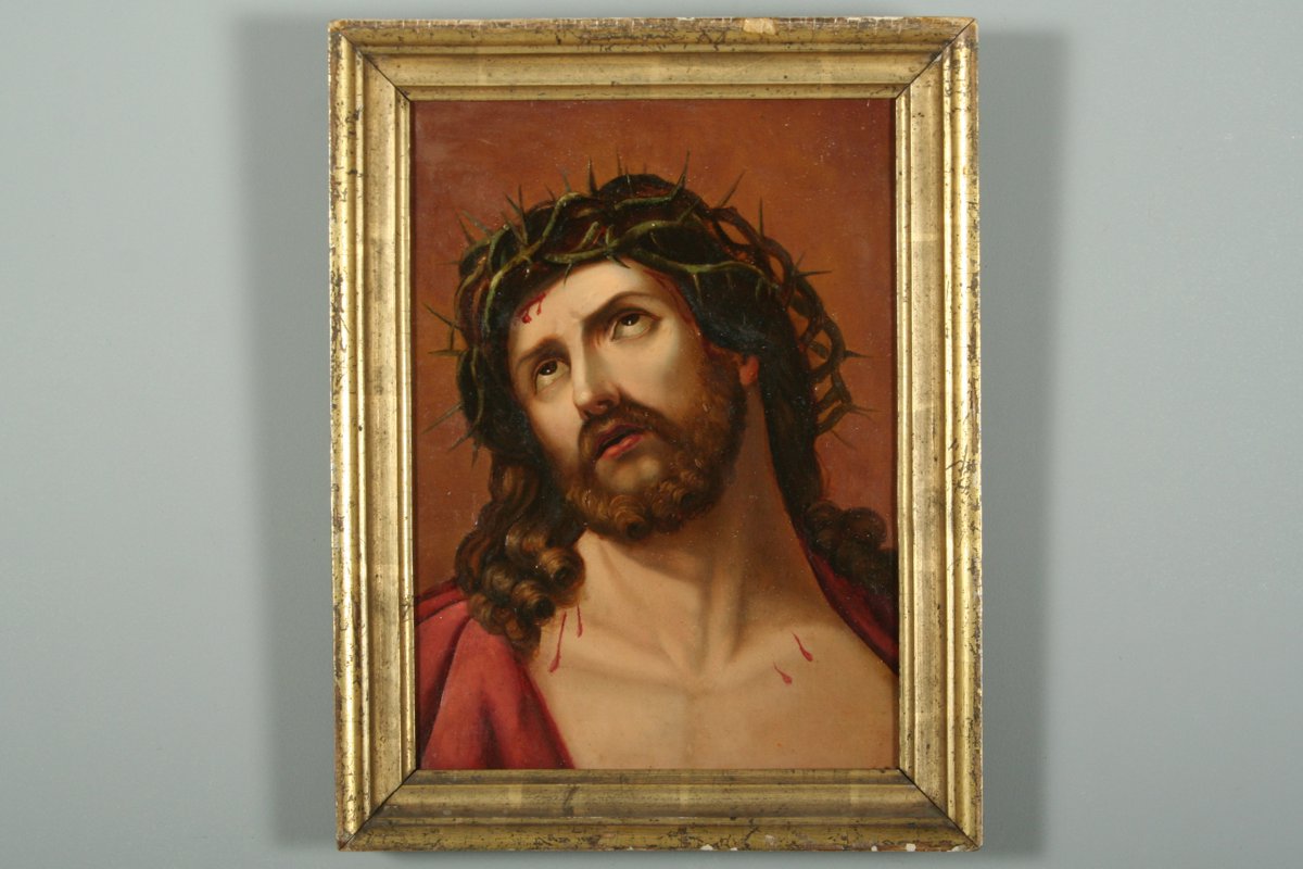 obraz Ježíše Krista s trnovou korunou, olej na plátně, 34 x 25 cm s rámem 42 x 33 cm, autor neznámý 19. století, rámováno v původním zlaceném rámu