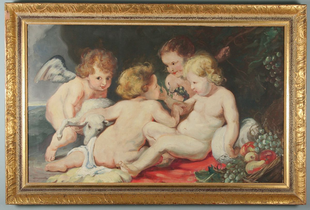 vyobrazení podle Paula Rubense maláho Krista a sv. Jana se dvěma andílky, olej na plátně 60 x 100 cm s rámem 78 x 115 cm, autor neznámý, neznačeno, rámováno