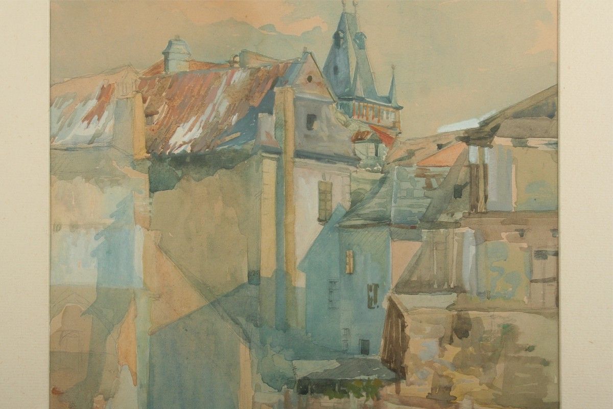 obraz zákoutí staré Prahy akvarel na papíře ve výřezu 36 x 26 cm, s rámem 56 x 43 cm, autor Rudolf Černý podepsáno vpravo dole Černý Rud. 07, rámováno v paspartě a ozdobném rámu pod sklem